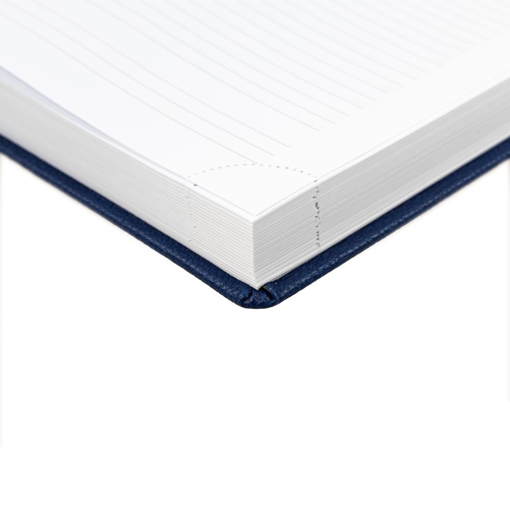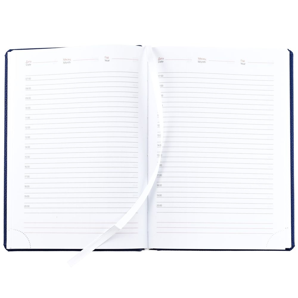 Ежедневник в твердой обложке c поролоном, выполнен из материала La Fite, синий НН, дополнен ляссе белого цвета.Блок 920:Кол-во страниц — 336;Бумага — белая, плотность 70 г/м?;Форзац и нахзац — белого цвета.