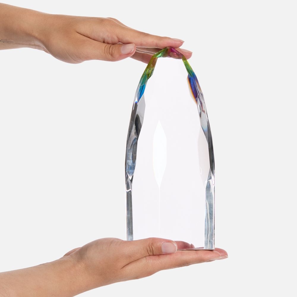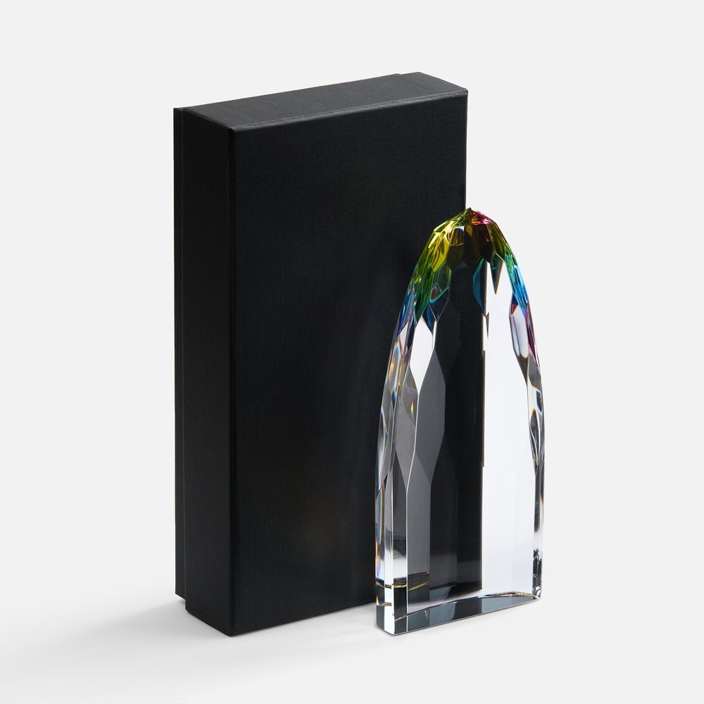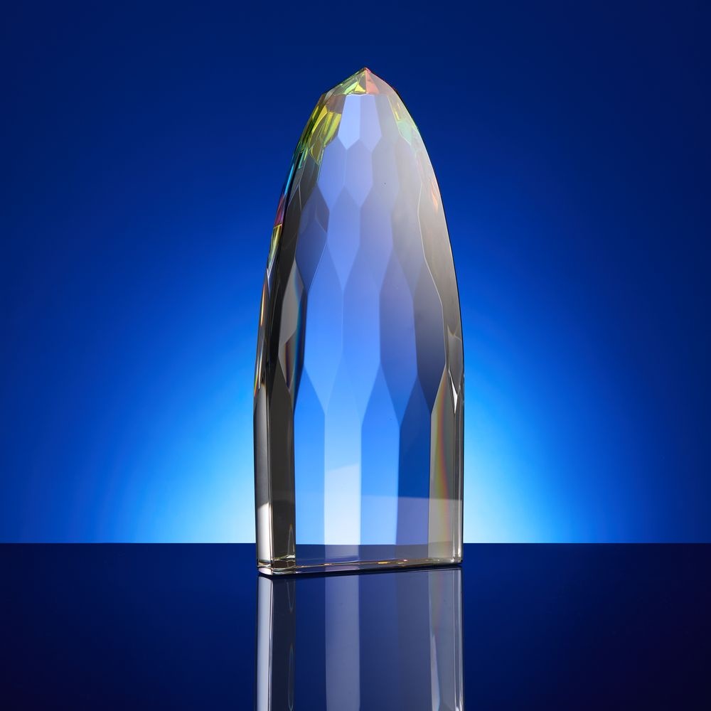 Объемная высокая стела Gleampeak олицетворяет стремление к победам и блестящий успех, свет от которого будет еще долго разливаться вокруг. Необычная форма с легкой огранкой и плавно скошенными краями усиливает визуальный эффект и создает притягательные отблески по всей стеле — она словно светится изнутри! Такое разноцветное свечение — яркий символ творческого подхода, который окрасит в разные оттенки любое дело.Gleampeak. Сияй ярко!Поставляется в подарочной коробке.
