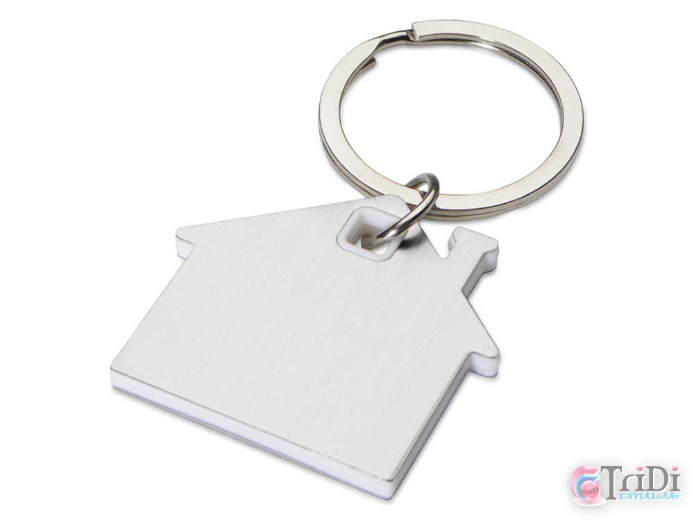 Брелок для ключей в форме домика с цветной вставкой из пластика между 2-мя серебристыми пластинами из стали.
