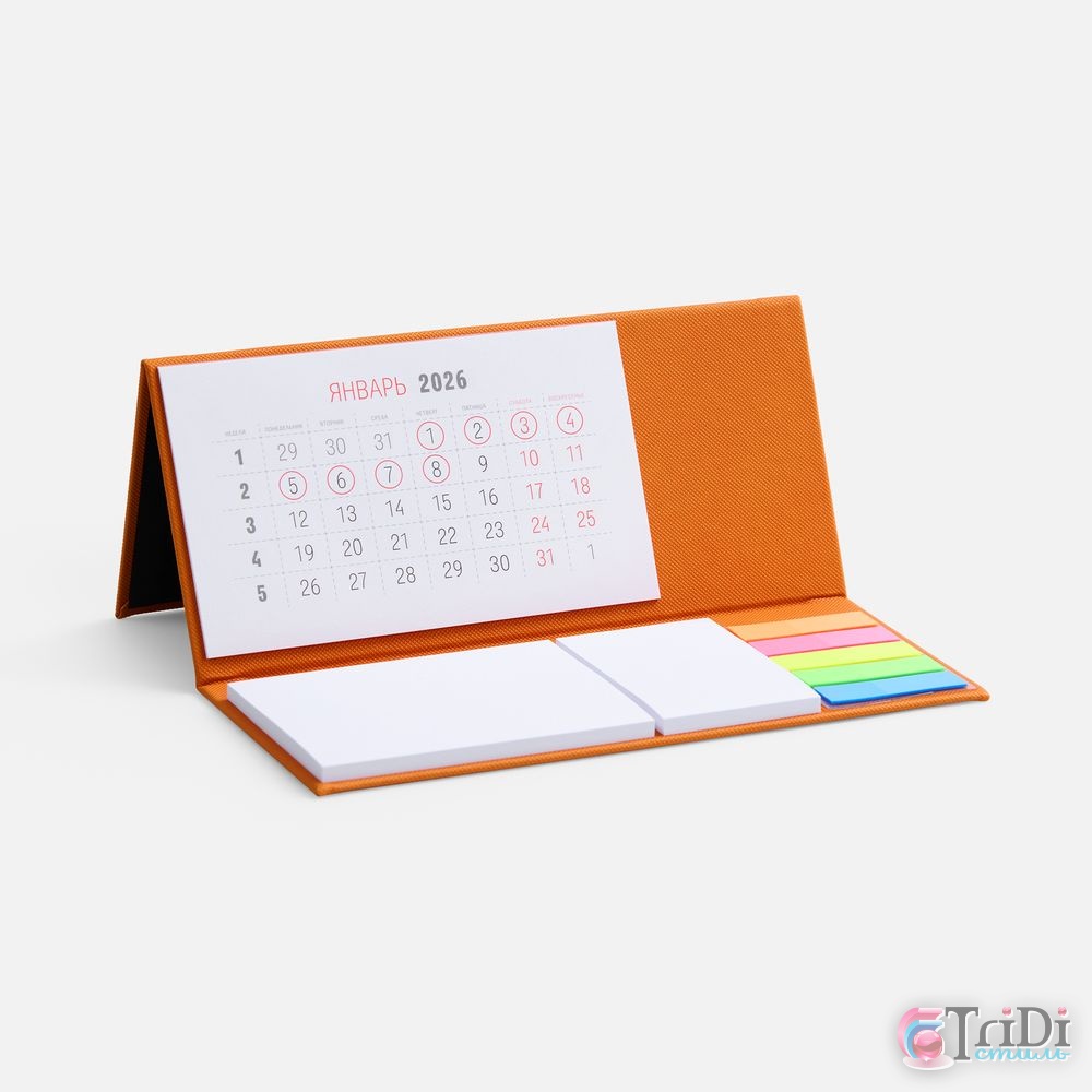 Календарь на 2026 год.Настольный календарь-домик из материала Canyon, оранжевый ОО Календарь 14,5х8,6 см, 12 листов;2 блока с клеевым слоем 10х7,5 см и 5х7,5 см, 50 листов; пластиковые закладки 1,2х4,3 см, 5х25 листов.