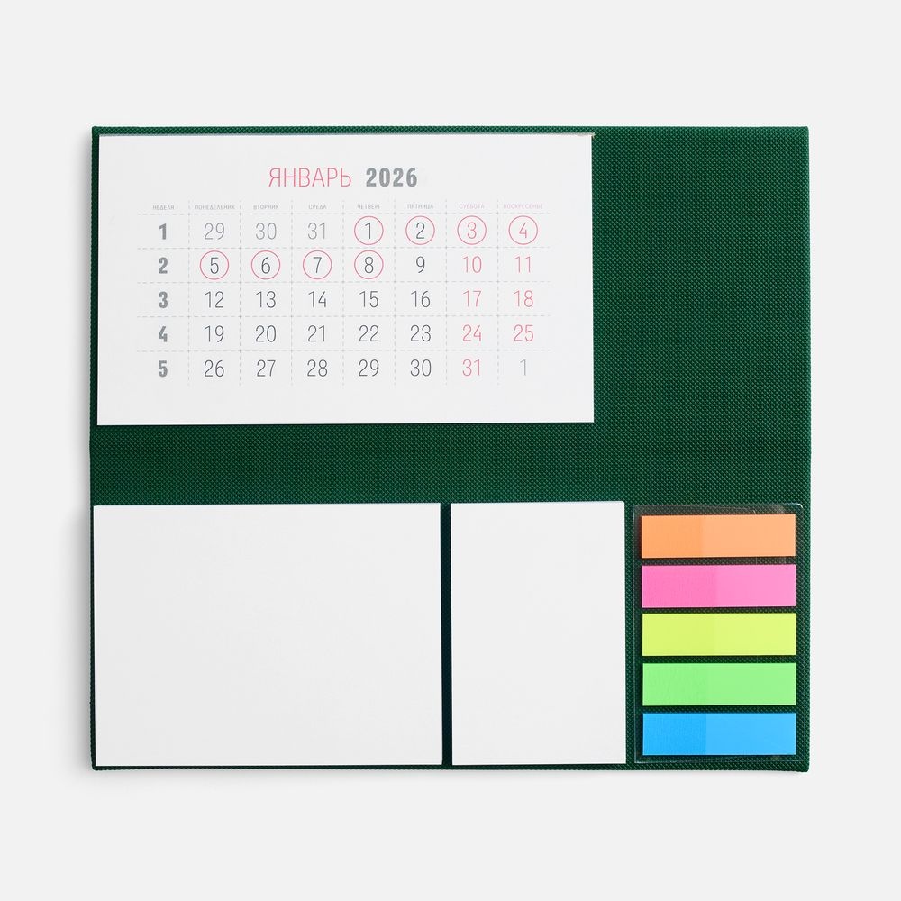 Календарь на 2026 год.Настольный календарь-домик из материала Canyon, зеленый FF. Календарь 14,5х8,6 см, 12 листов;Блок с клеевым слоем 10х7,5 см и 5х7,5 см, 50 листов; блок с клеевым слоем 5х7,5 см, 50 листов; пластиковые закладки 1,2х4,3 см, 5х25 листов.