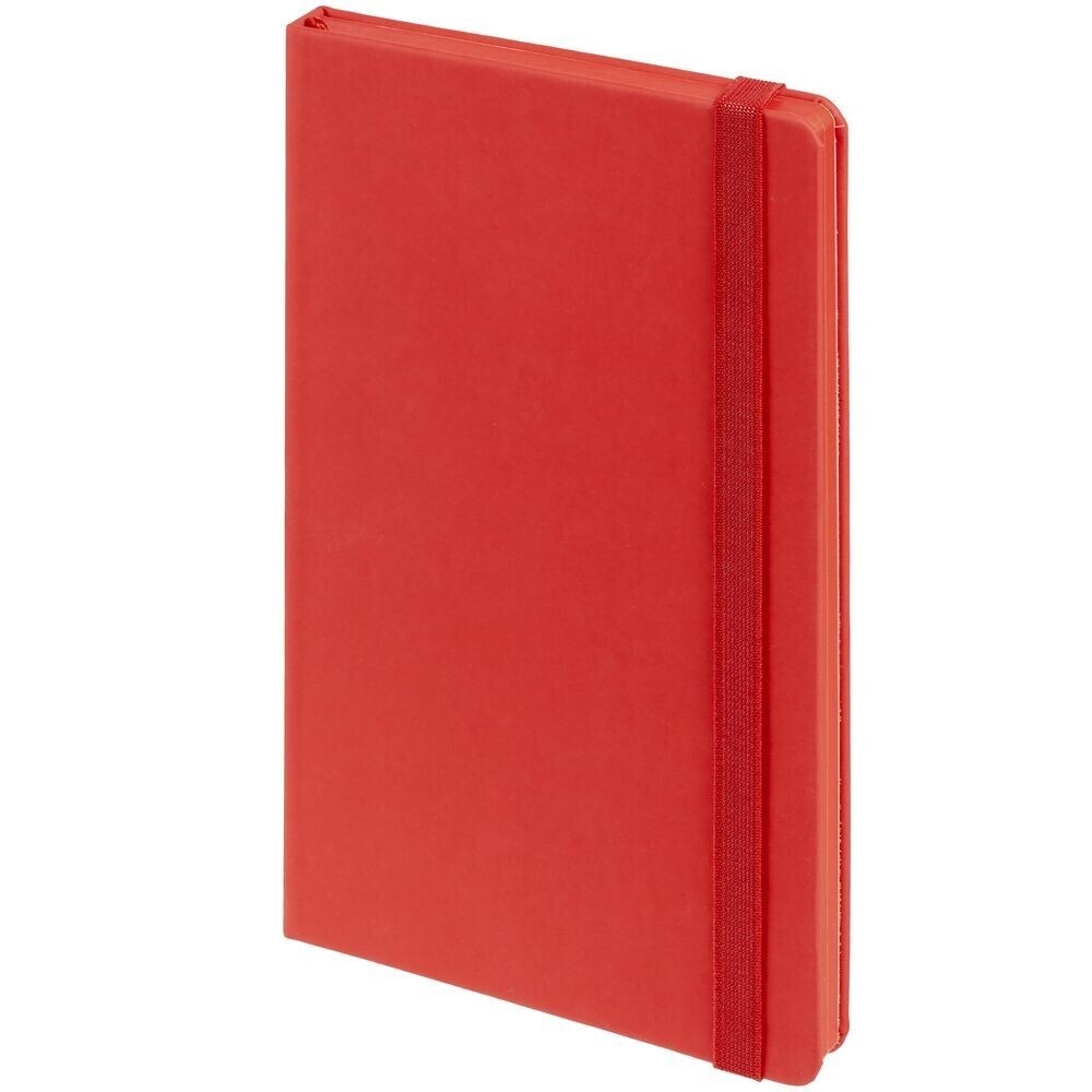 Блокнот в твердой обложке, выполнен из материала Soft Touch Ultra, красный РР, дополнен резинкой и ляссе в цвет обложки.