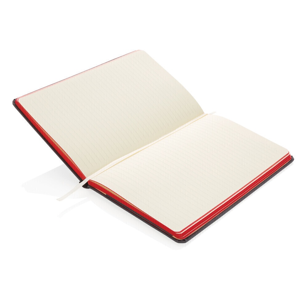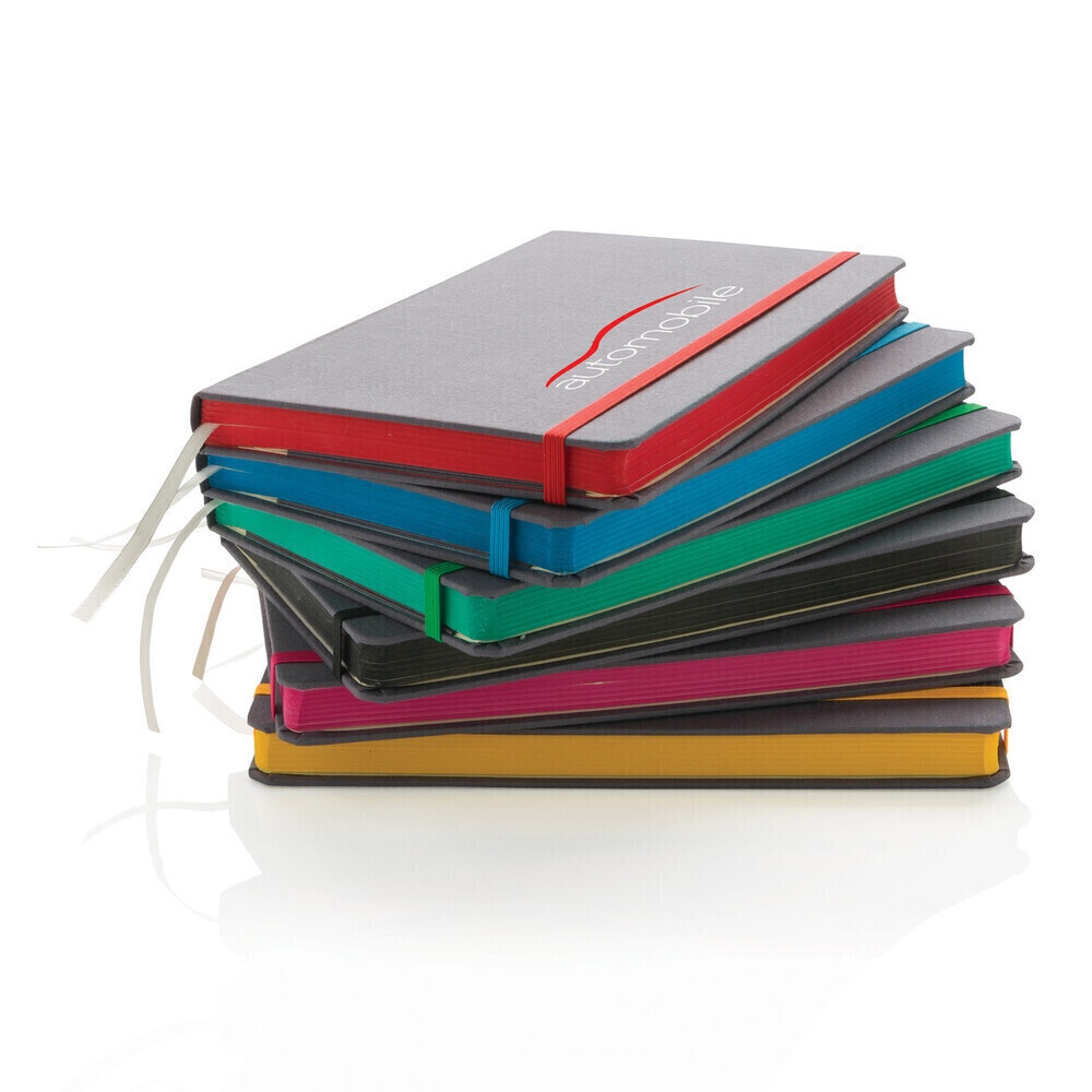 Блокнот для записей Deluxe fabric в тканевой обложке с цветным срезом. 120 страниц, линованная бумага кремового цвета плотностью 80 г/м2. Кромка страниц сочетается по цвету с резинкой.