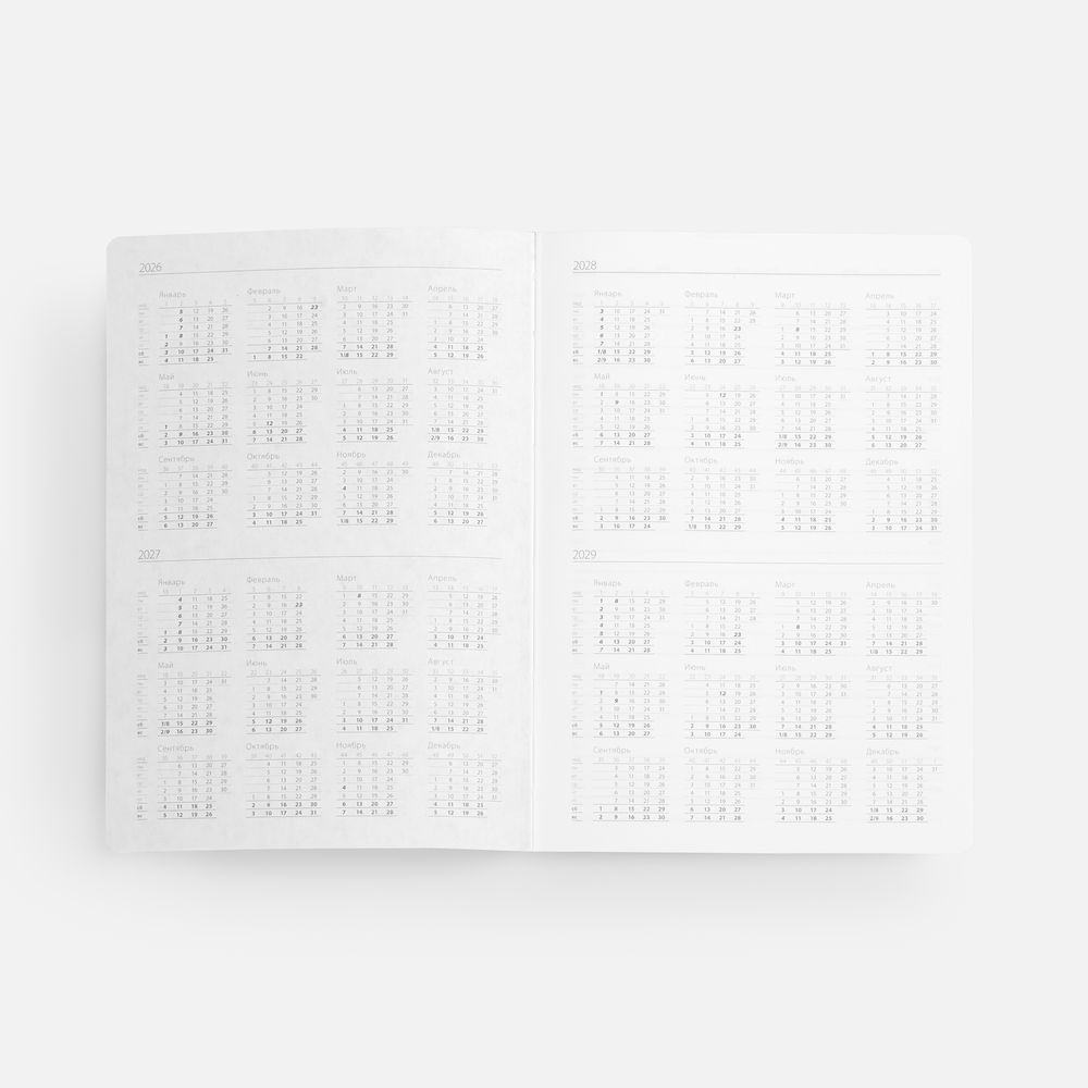 Гибкая обложка выполнена из материала Velour Melange, серый СС и Latte, бирюзовый II (внутренняя часть обложки). Внутри корешка — специальное место для крепления ручки размером до 15х0,9 см.Блок 985:Кол-во страниц — 256;Бумага — белая, плотность 70 г/м?;Обрез блока — цветной;Форзац и нахзац — белые.