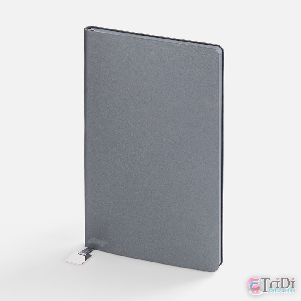 Ежедневник с гибкой обложкой, выполнен из материалов Soft Touch Pearl, серый СС, и Latte, серый (внутренняя часть обложки), дополнен ляссе в цвет обложки с металлическим шильдиком.