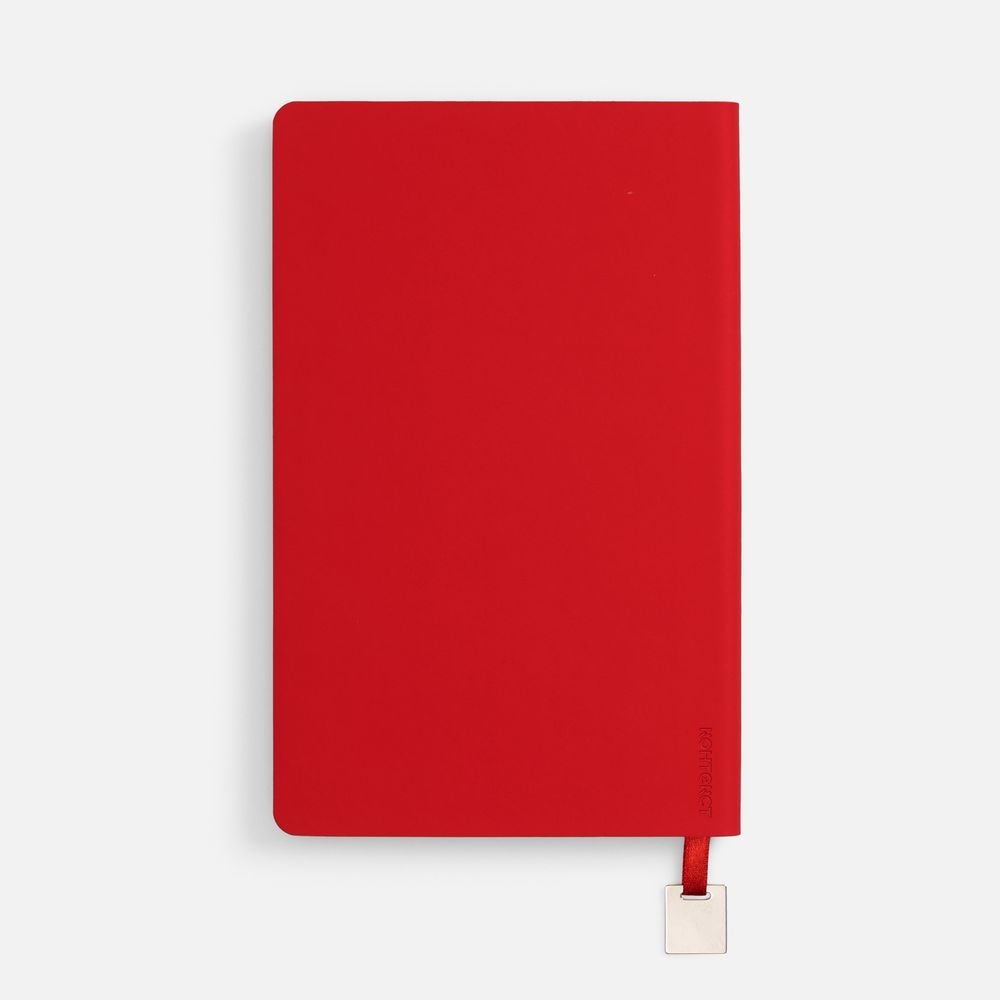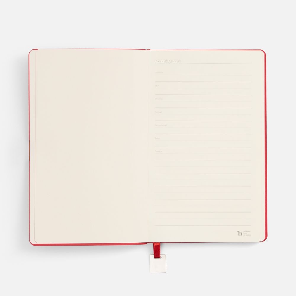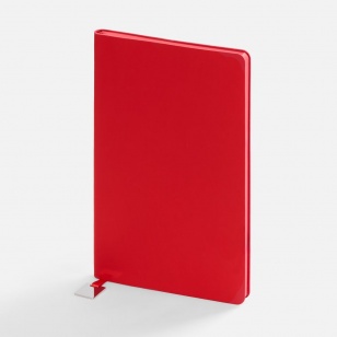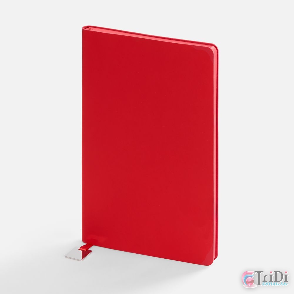 Ежедневник с гибкой обложкой, выполнен из материалов Soft Touch Ultra, красный РР, и Latte, красный (внутренняя часть обложки), дополнен ляссе в цвет обложки с металлическим шильдиком.