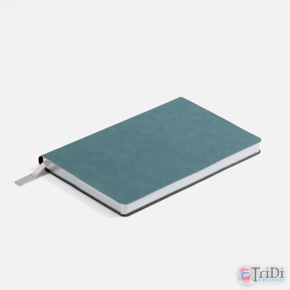 Ежедневник с гибкой обложкой, выполнен из материала Petrus, голубой JJ, дополнен серым ляссе с металлическим шильдиком.Блок 951, без календарной сетки и информационного блока:Кол-во страниц — 256;Бумага — белая, плотность 70 г/м?;Форзац и нахзац — белыеОбрез блока — серебристый.