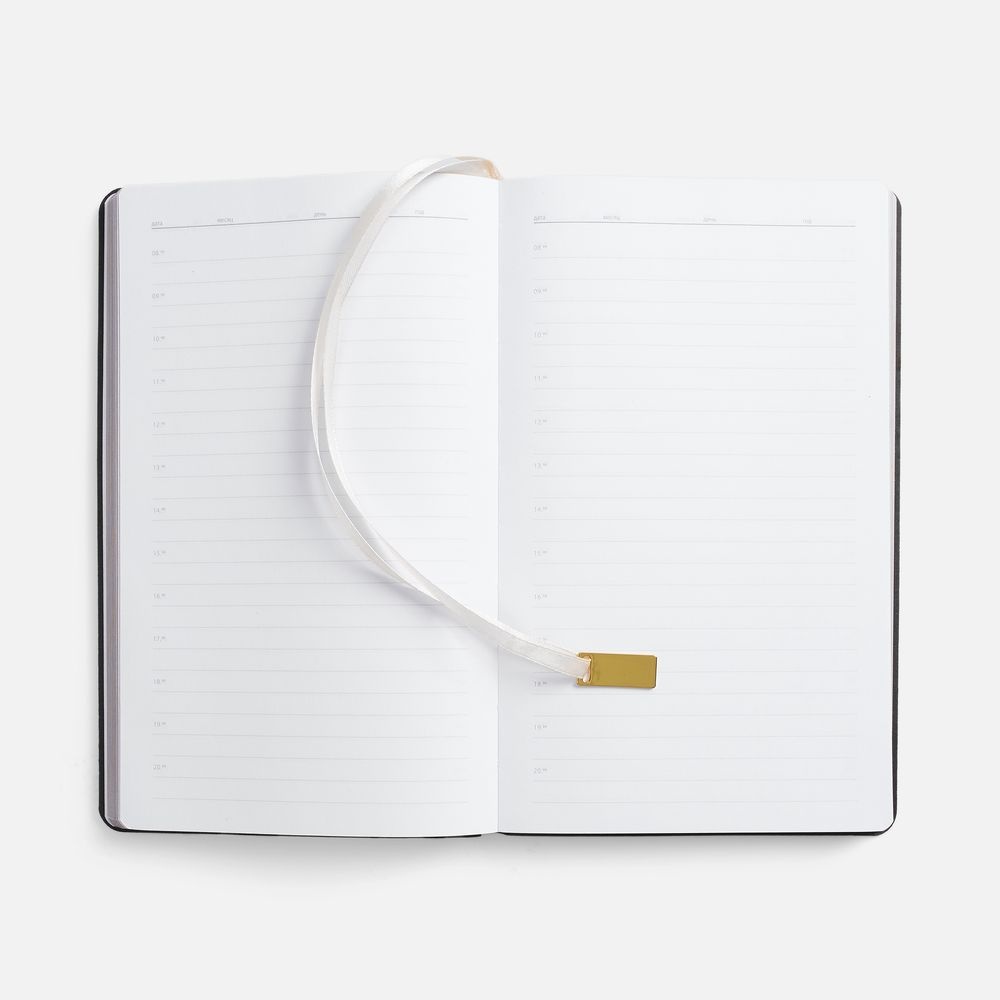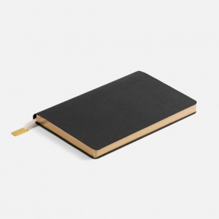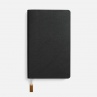 Ежедневник с гибкой обложкой, выполнен из материала Petrus, черный АА, дополнен серым ляссе с металлическим золотистым шильдиком.Блок 951, без календарной сетки и информационного блока:Кол-во страниц — 256;Бумага — белая, плотность 70 г/м?;Форзац и нахзац — белыеОбрез блока — золотистый.