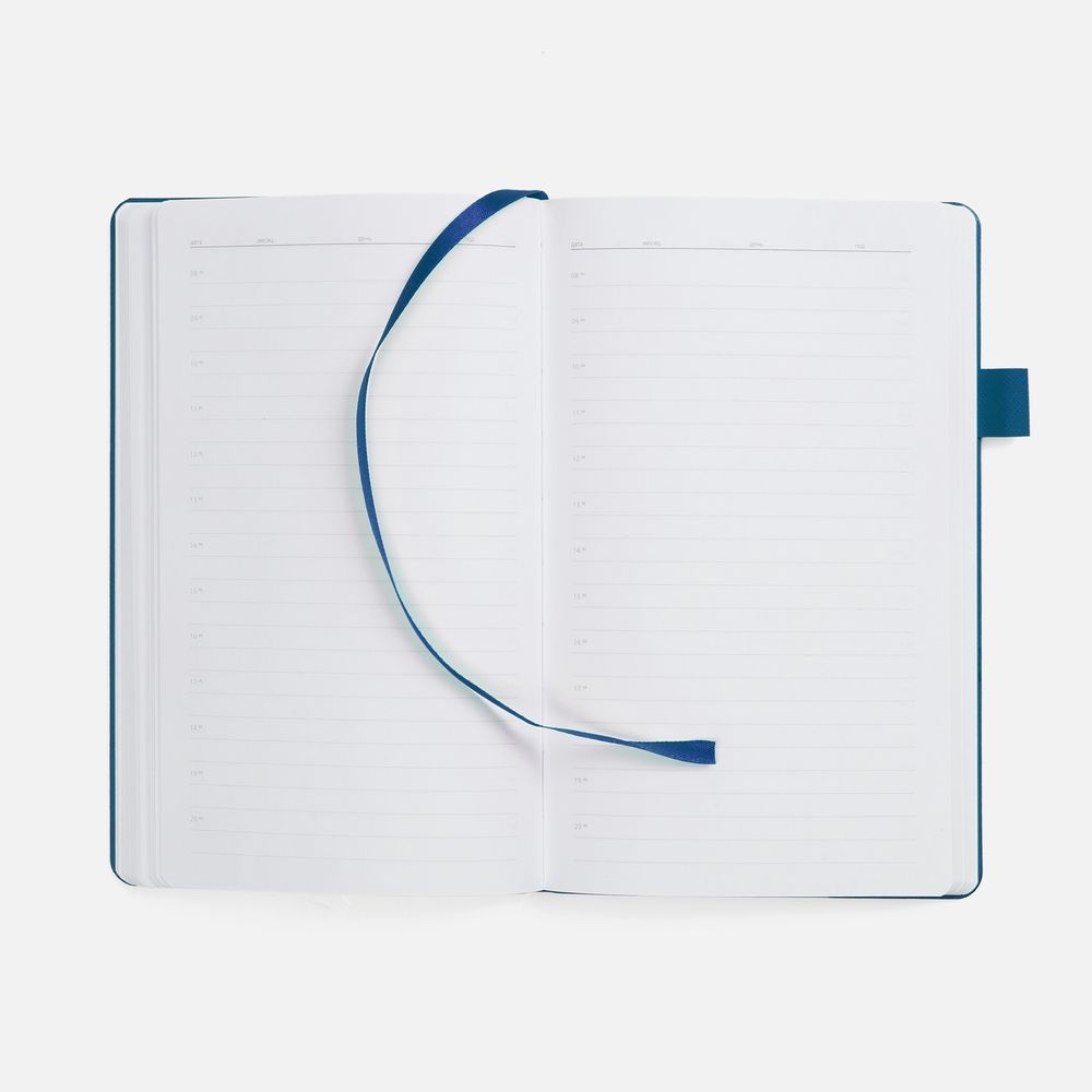 Гибкая обложка, материал обложки — Soft Touch, белый BB и Latte, синий НН; материал петли для ручки — Nice Touch, синий НН. Срез обложки окрашен в синий цвет.Блок 951, без календарной сетки и информационного блока:Кол-во страниц — 256;Бумага — белая, плотность 70 г/м?;Форзац и нахзац — синего цвета.Ежедневник поставляется в термопленке