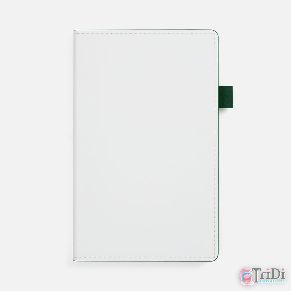 Гибкая обложка, материал обложки — Soft Touch, белый BB и Latte, зеленый FF; материал петли для ручки — Nice Touch, зеленый FF. Срез обложки окрашен в зеленый цвет.