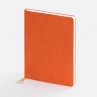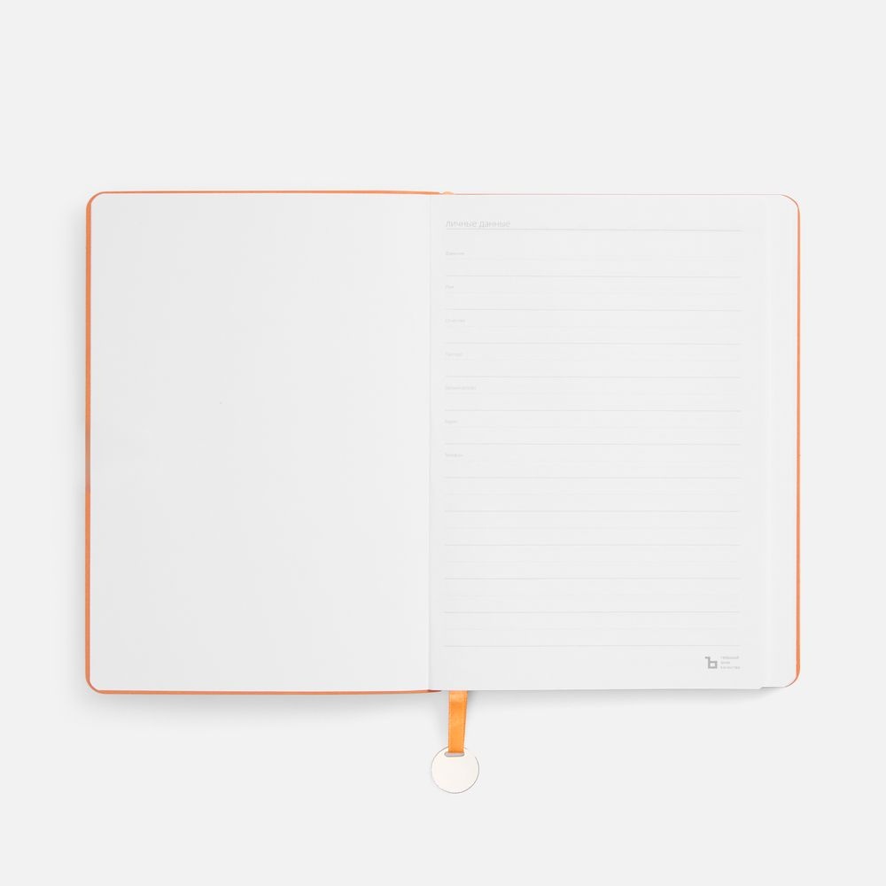 Ежедневник с гибкой обложкой, выполнен из материал La Fite, оранжевый ОО, дополнен ляссе в цвет обложки с металлическим шильдом.Блок 985, без календарной сетки и информационного блока:Кол-во страниц — 256;Бумага — белая, плотность 70 г/м?;Форзац и нахзац — белые.