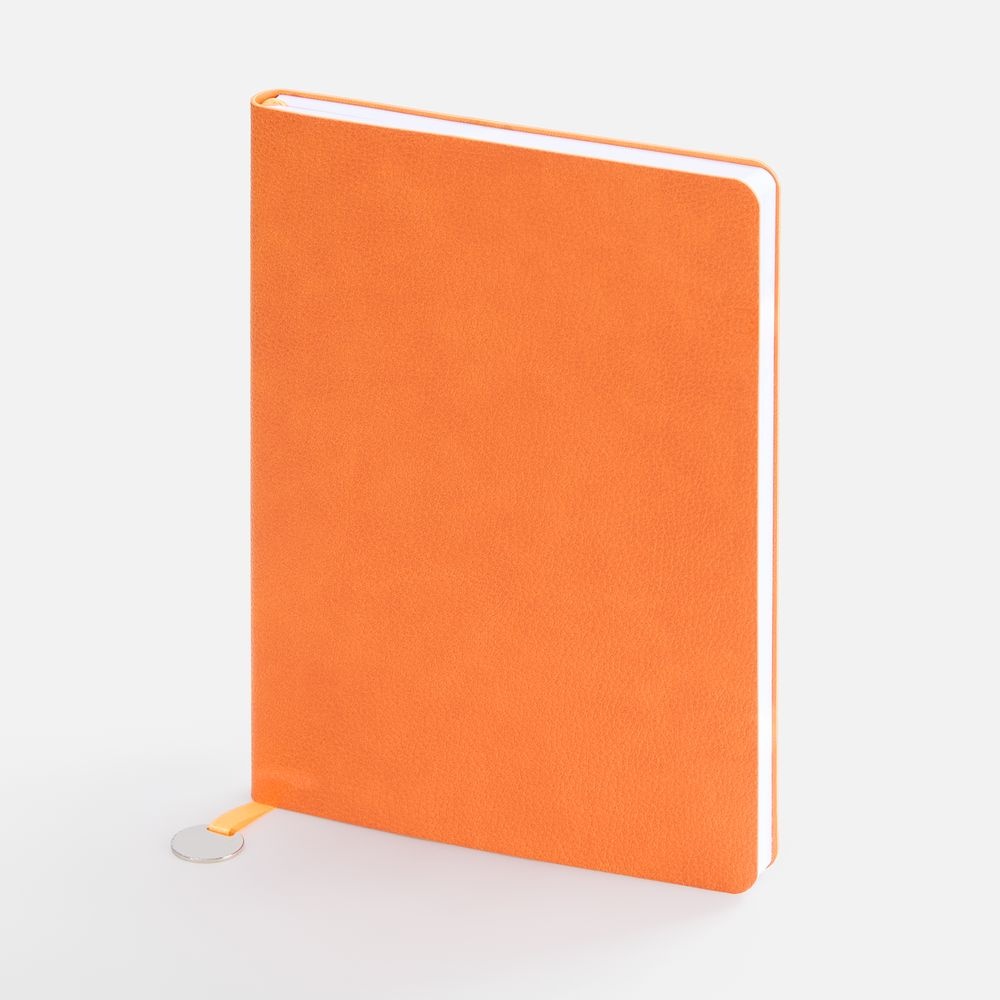 Ежедневник с гибкой обложкой, выполнен из материал La Fite, оранжевый ОО, дополнен ляссе в цвет обложки с металлическим шильдом.