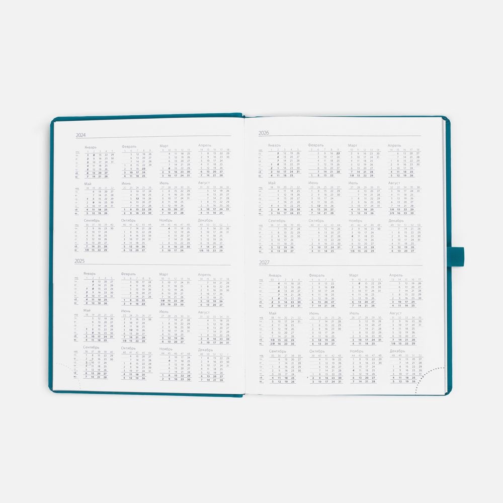 Ежедневник с твердой обложкой без поролона, выполнен из материала Soft Touch, цвет морской волны II, дополнен резинкой шириной 1 см, петлей-резинкой для ручки, капталом и ляссе темно-бирюзового цвета.Блок 922, с информационным блоком:Кол-во страниц — 336;Бумага — белая, плотность 70 г/м?;Форзац и нахзац — белого цвета.