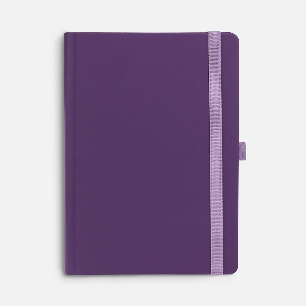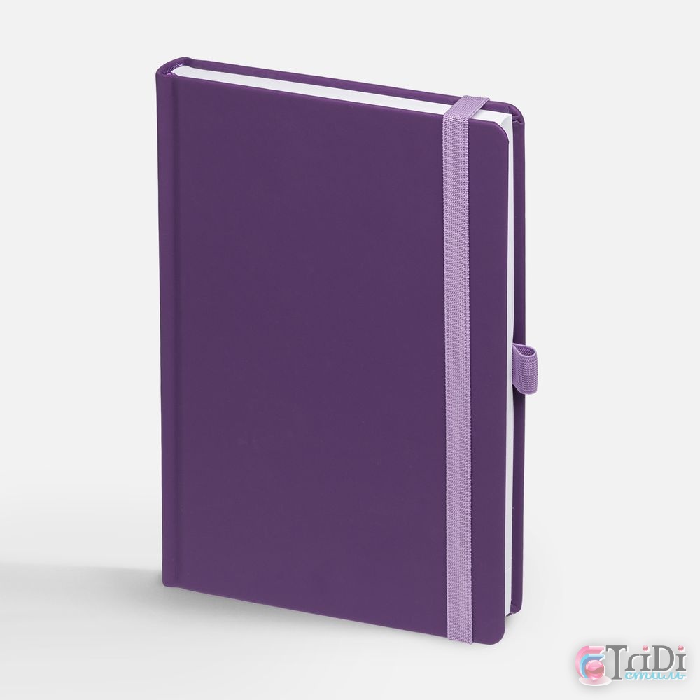 Ежедневник с твердой обложкой без поролона, выполнен из материала Soft Touch, фиолетовый UU, дополнен резинкой шириной 1 см, петлей-резинкой для ручки, капталом и ляссе в цвет обложки.