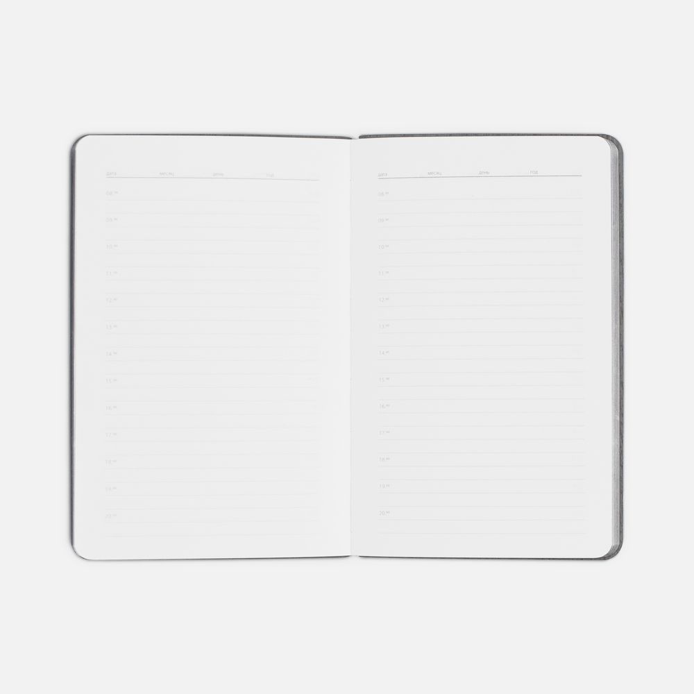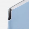 Ежедневник с гибкой обложкой выполнен из материала Soft Touch, голубой JJ и серого Latte (внутренняя часть обложки). Внутри корешка — специальное место для крепления ручки размером до 15х0,9 см.
