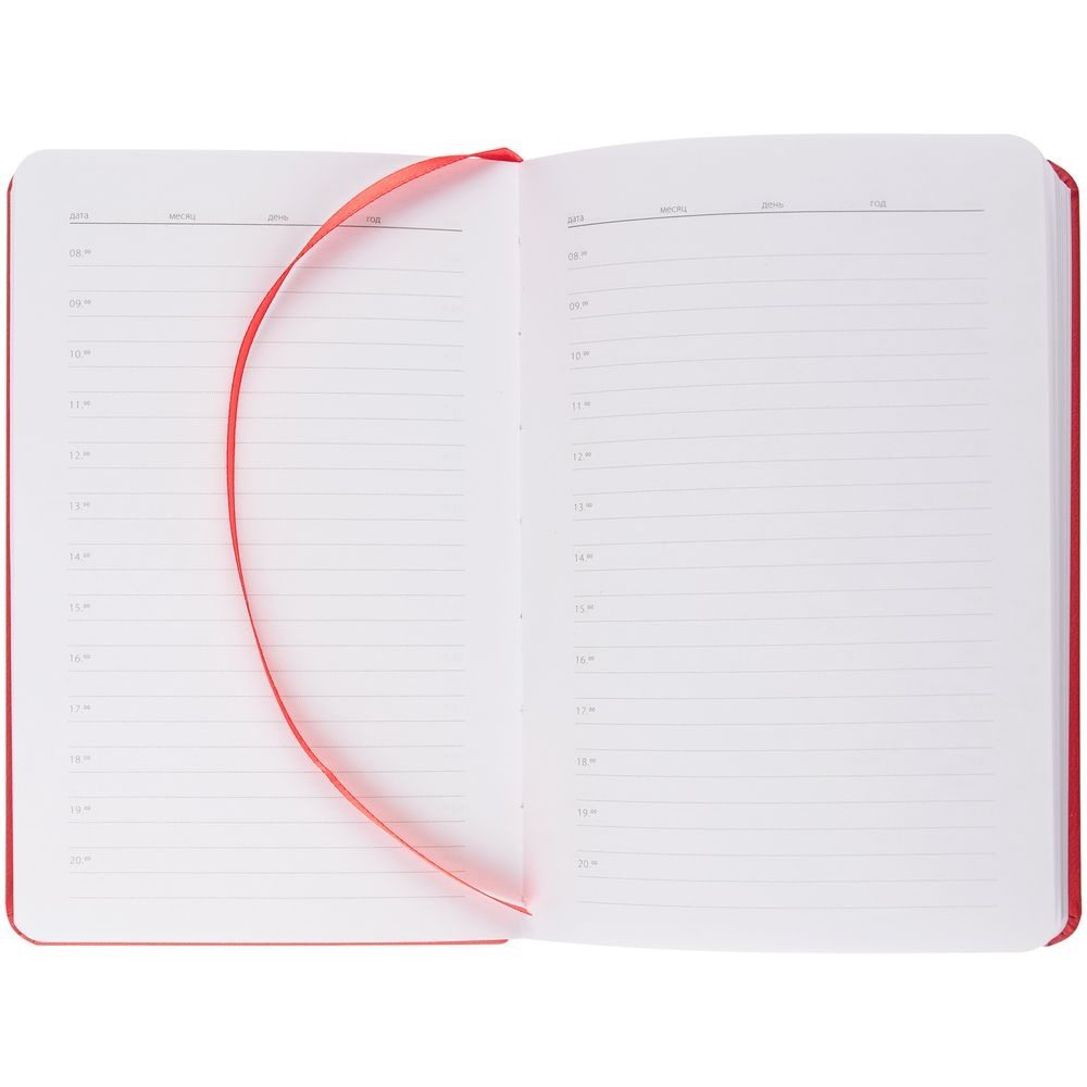 Ежедневник с твердой обложкой, выполнен из материала Latte, красный РР, дополнен ляссе в цвет обложки.Блок 212, без календарной сетки и информационного блока:Кол-во страниц — 192;Бумага — белая, плотность 70 г/м?;Форзац и нахзац — белые.