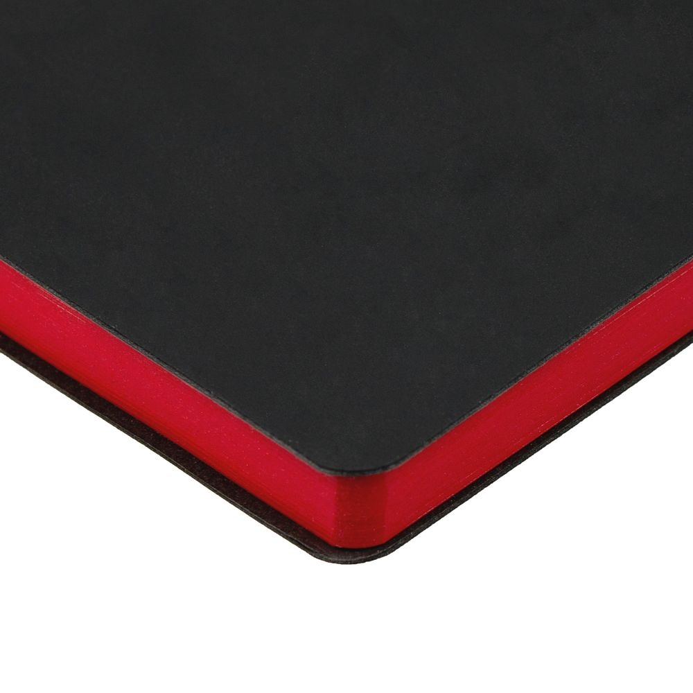 Ежедневник с гибкой обложкой, выполнен из материала Soft Touch, черный АА, дополнен петлей для ручки из материала Nice Touch Ultra, красный РР и цветным ляссе. Блок 985, без календарной сетки и информационного блока:Кол-во страниц — 256;Бумага — белая, плотность 70 г/м?;Форзац и нахзац — красные;Обрез блока — красный.
