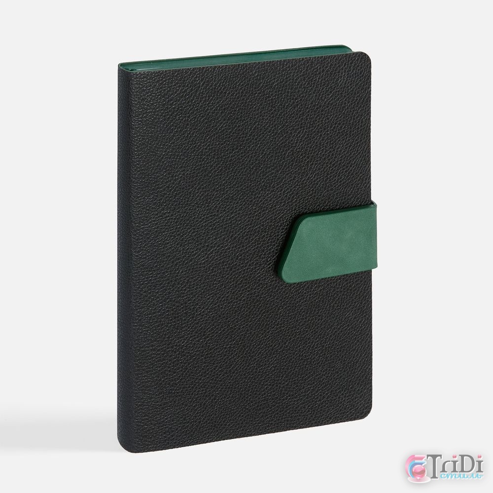 Ежедневник с гибкой обложкой, выполнен из материала La Fite, черный АА и NubuckTouch, зелёный, дополнен зеленым ляссе и хлястиком на кнопке.Блок 985, без информационного блока:Кол-во страниц — 256;Бумага — белая, плотность 70 г/м?;Обрез блока — зеленый;Форзац и нахзац — белые.