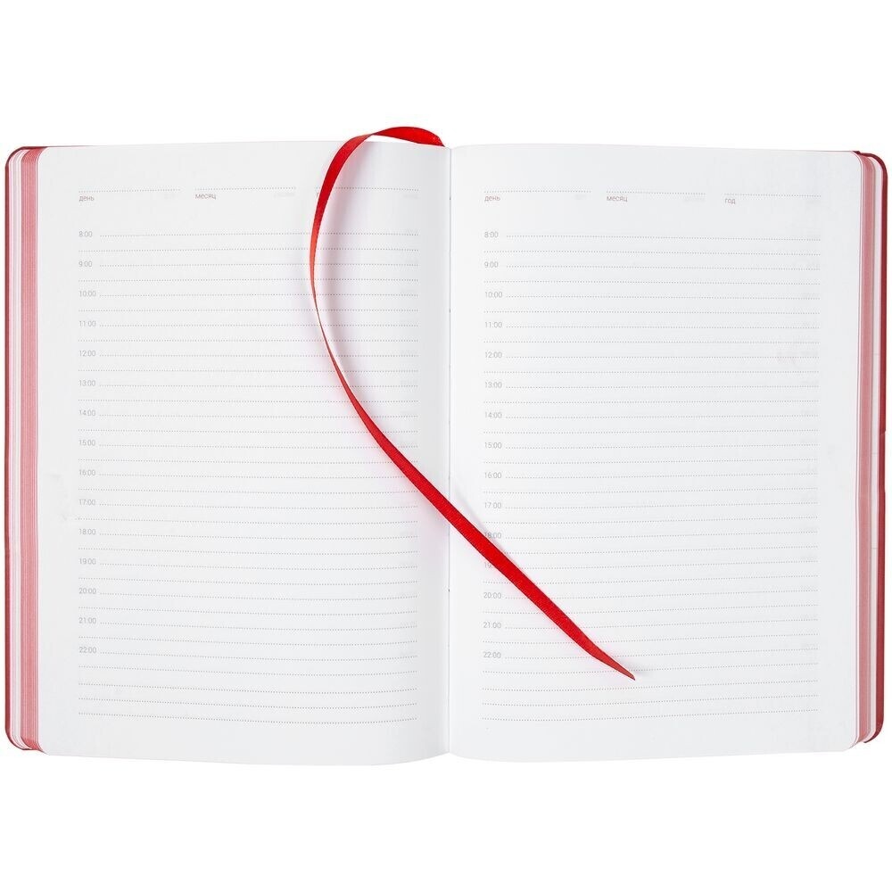 Ежедневник с твердой обложкой, выполнен из материала Brand, красный РР, обрез красного цвета, дополнен резинкой и ляссе красного цвета.Блок 210:Кол-во страниц — 336;Бумага — белая, плотность 70 г/м?;Форзац и нахзац — белого цвета.