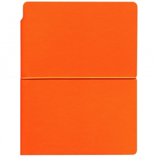 Ежедневник с гибкой обложкой выполнена из материала Nice Touch, оранжевый и Latte, оранжевый (внутренняя часть обложки), дополнен горизонтальной резинкой в цвет обложки. Внутри корешка — специальное место для крепления ручки размером до 15х1 см.