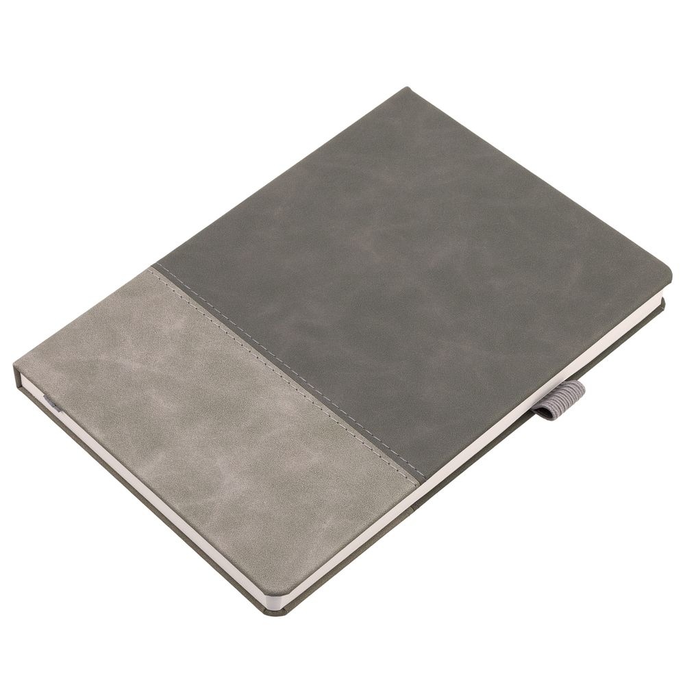 Ежедневник с твердой обложкой, без поролона, со сшивкой материалов Nubuck Touch серый СС, и Nubuck Touch тёмно-серый ЕЕ., дополнен двойным ляссе и петлей-резинкой для ручки.Блок 985, без календарной сетки и информационного блока:Кол-во страниц — 256;Бумага — белая, плотность 70 г/м?;Форзац и нахзац — белые.