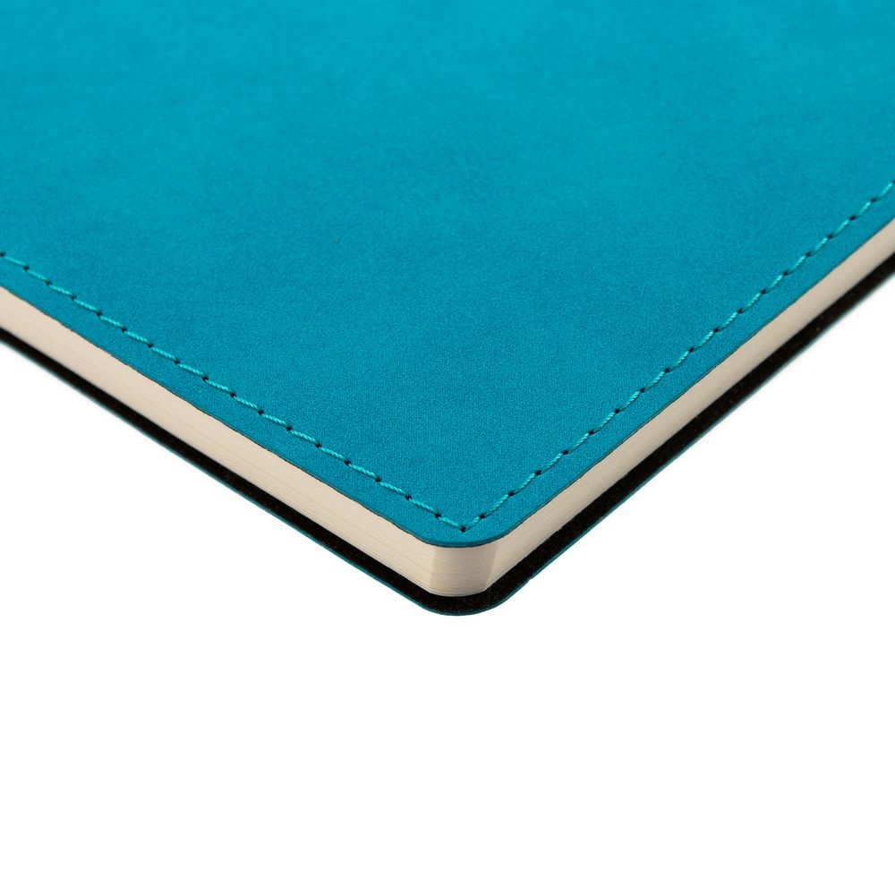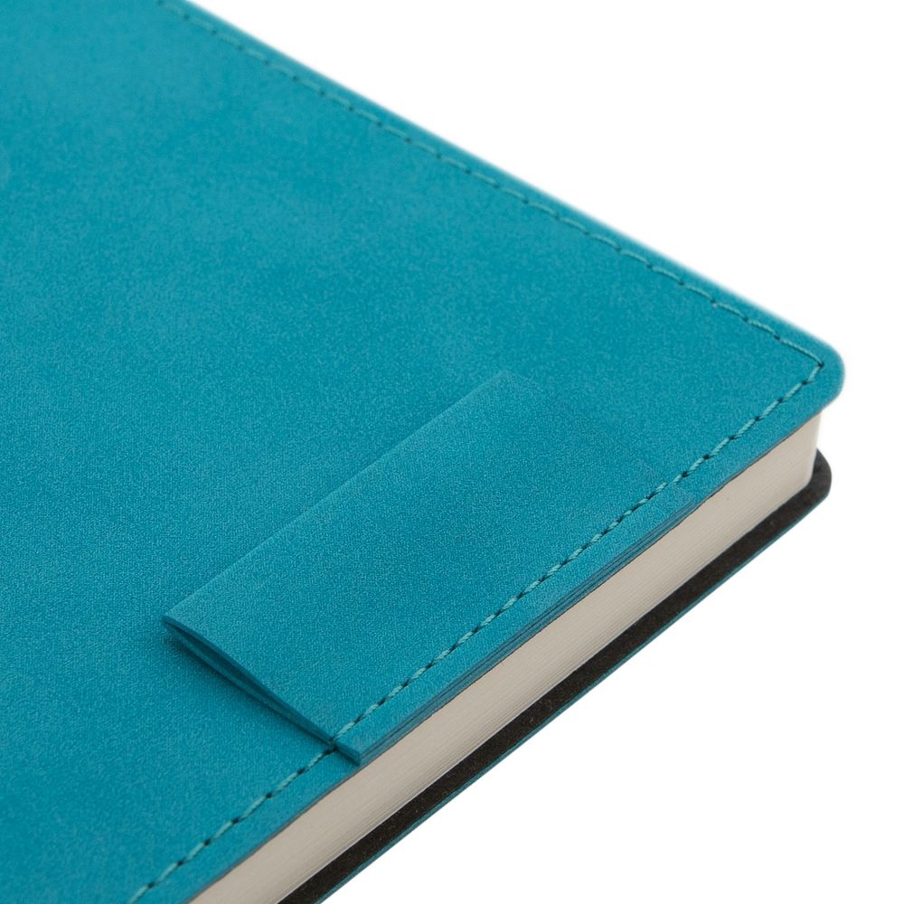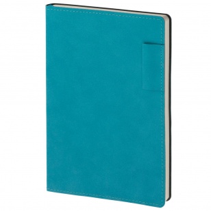 Ежедневник с гибкой обложкой, выполнен из материала Nubuck, цвет морской волны II, дополнен петлей-лейблом для ручки и ляссе в цвет материала.