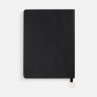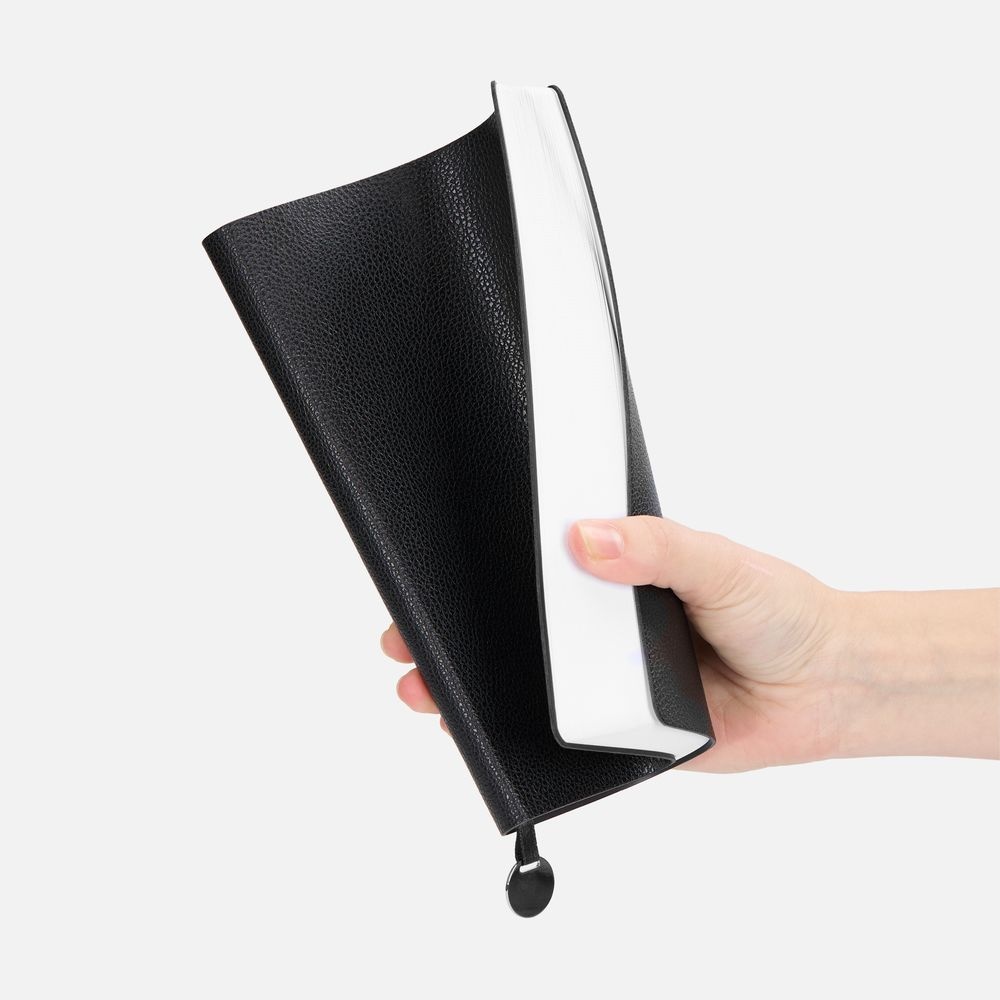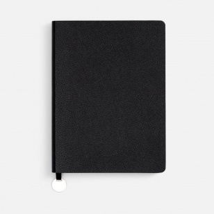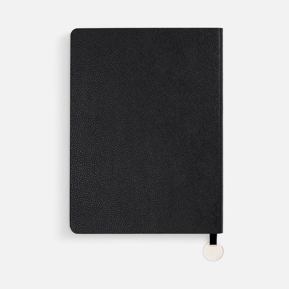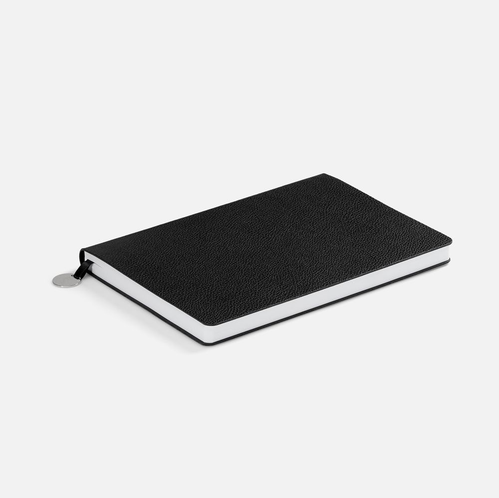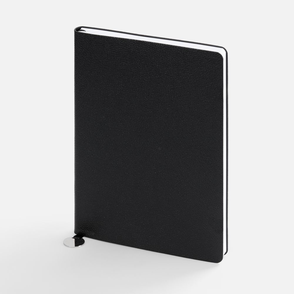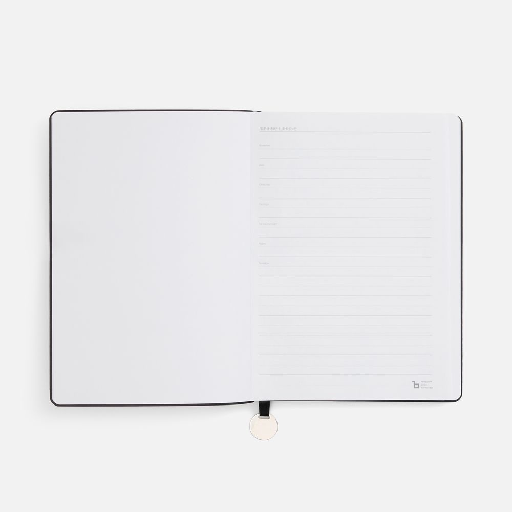 Ежедневник с гибкой обложкой, выполнен из материала La Fite, черный АА, дополнен ляссе в цвет обложки с металлическим шильдом.Блок 985, без календарной сетки и информационного блока:Кол-во страниц — 256;Бумага — белая, плотность 70 г/м?;Форзац и нахзац — белые.