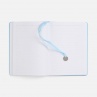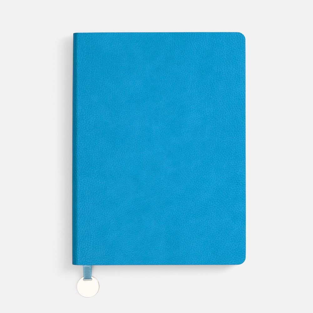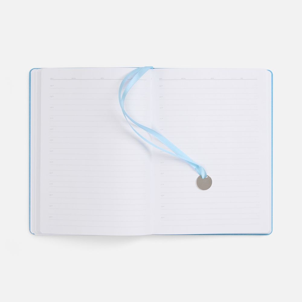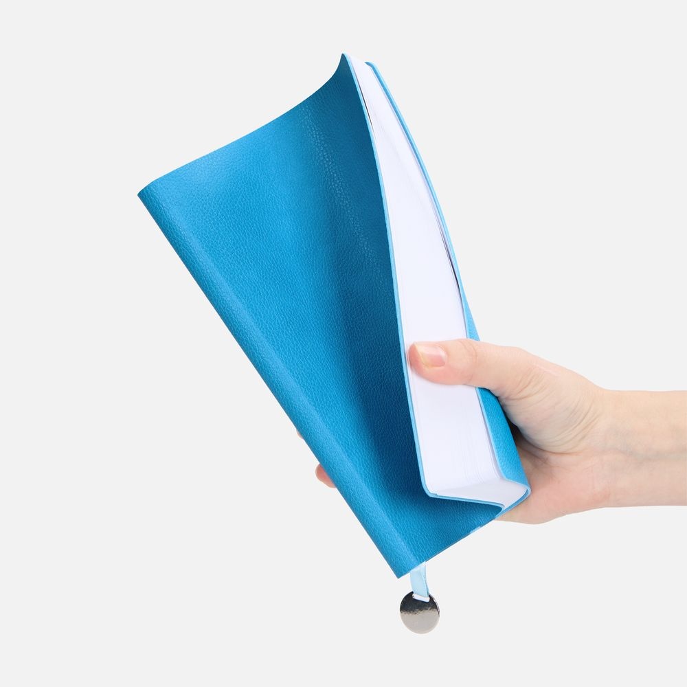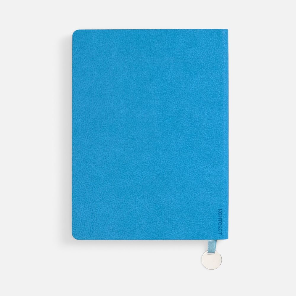 Ежедневник с гибкой обложкой, выполнен из материал La Fite, голубой JJ, дополнен ляссе в цвет обложки с металлическим шильдом.Блок 985, без календарной сетки и информационного блока:Кол-во страниц — 256;Бумага — белая, плотность 70 г/м?;Форзац и нахзац — белые.