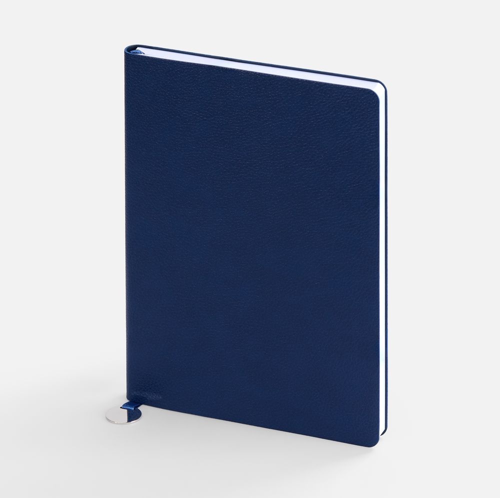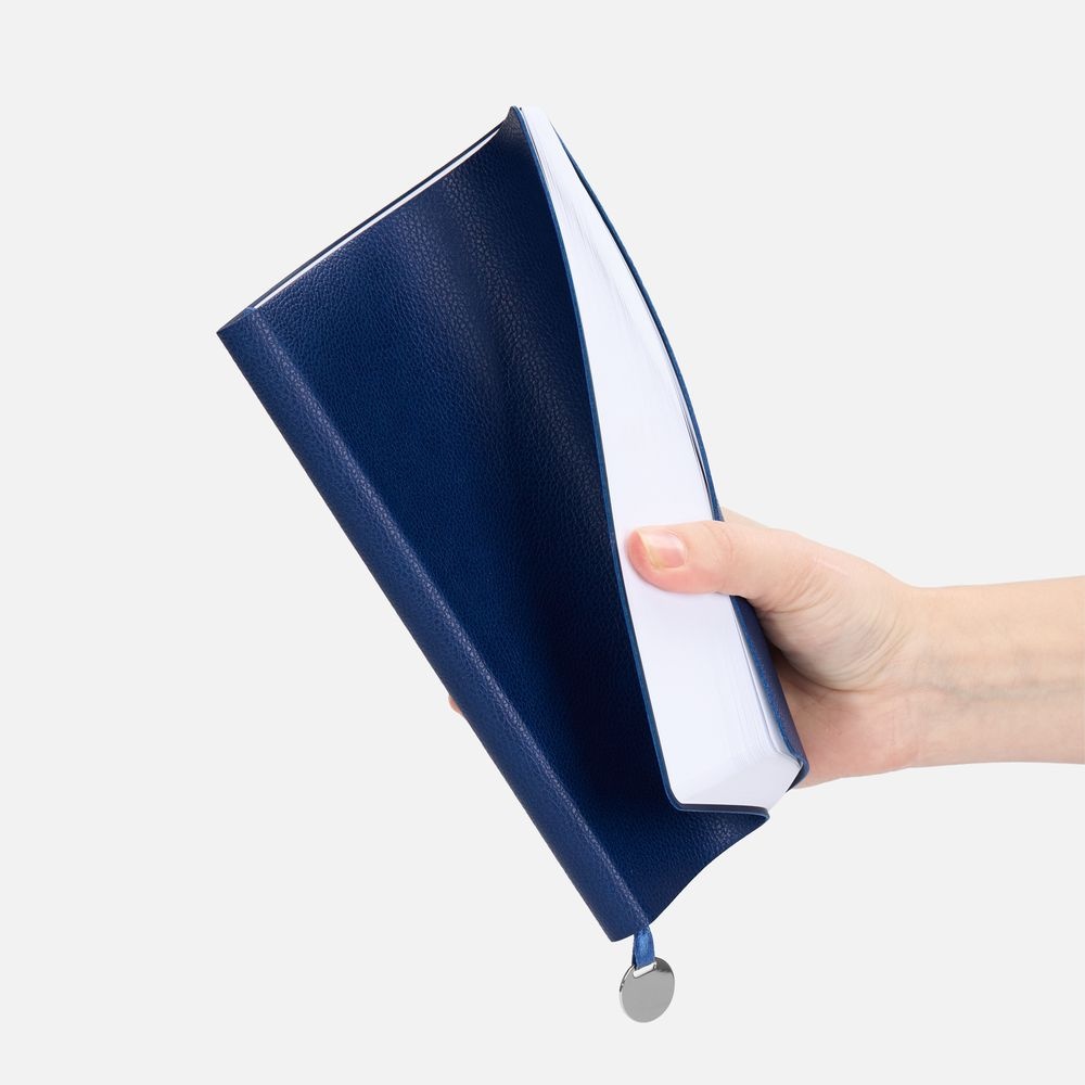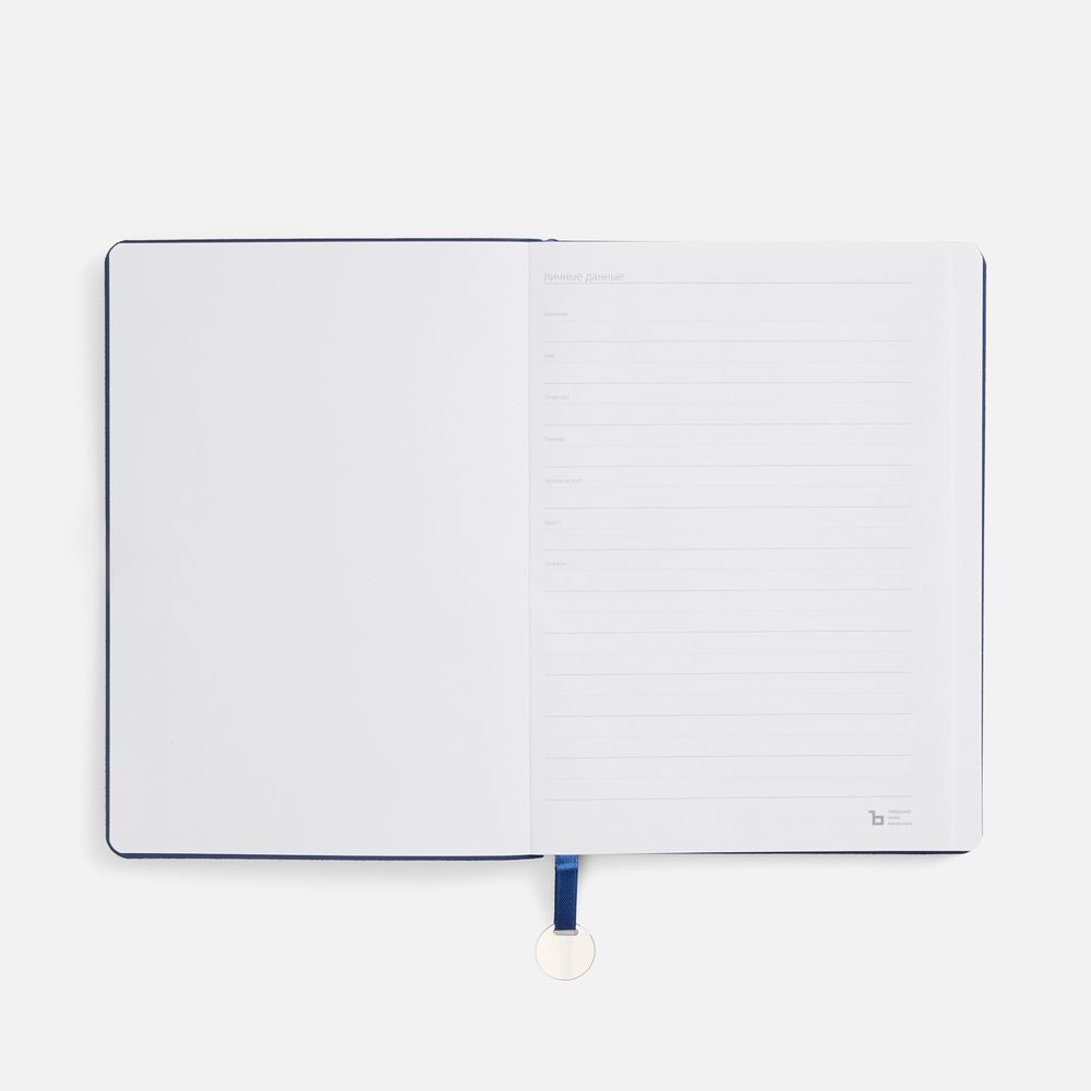 Ежедневник с гибкой обложкой, выполнен из материал La Fite, синий НН, дополнен ляссе в цвет обложки с металлическим шильдом.Блок 985, без календарной сетки и информационного блока:Кол-во страниц — 256;Бумага — белая, плотность 70 г/м?;Форзац и нахзац — белые.