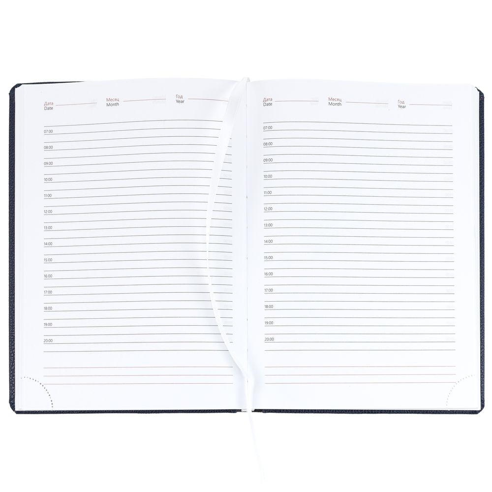Ежедневник в твердой обложке c поролоном, выполнен из материала La Fite, темно-синий ХХ, дополнен ляссе белого цвета.Блок 920:Кол-во страниц — 336;Бумага — белая, плотность 70 г/м?;Форзац и нахзац — белого цвета.