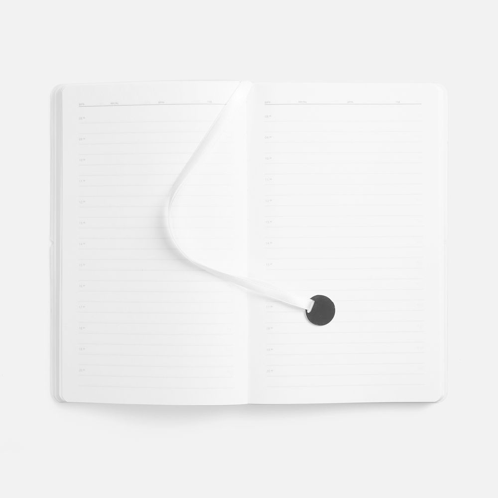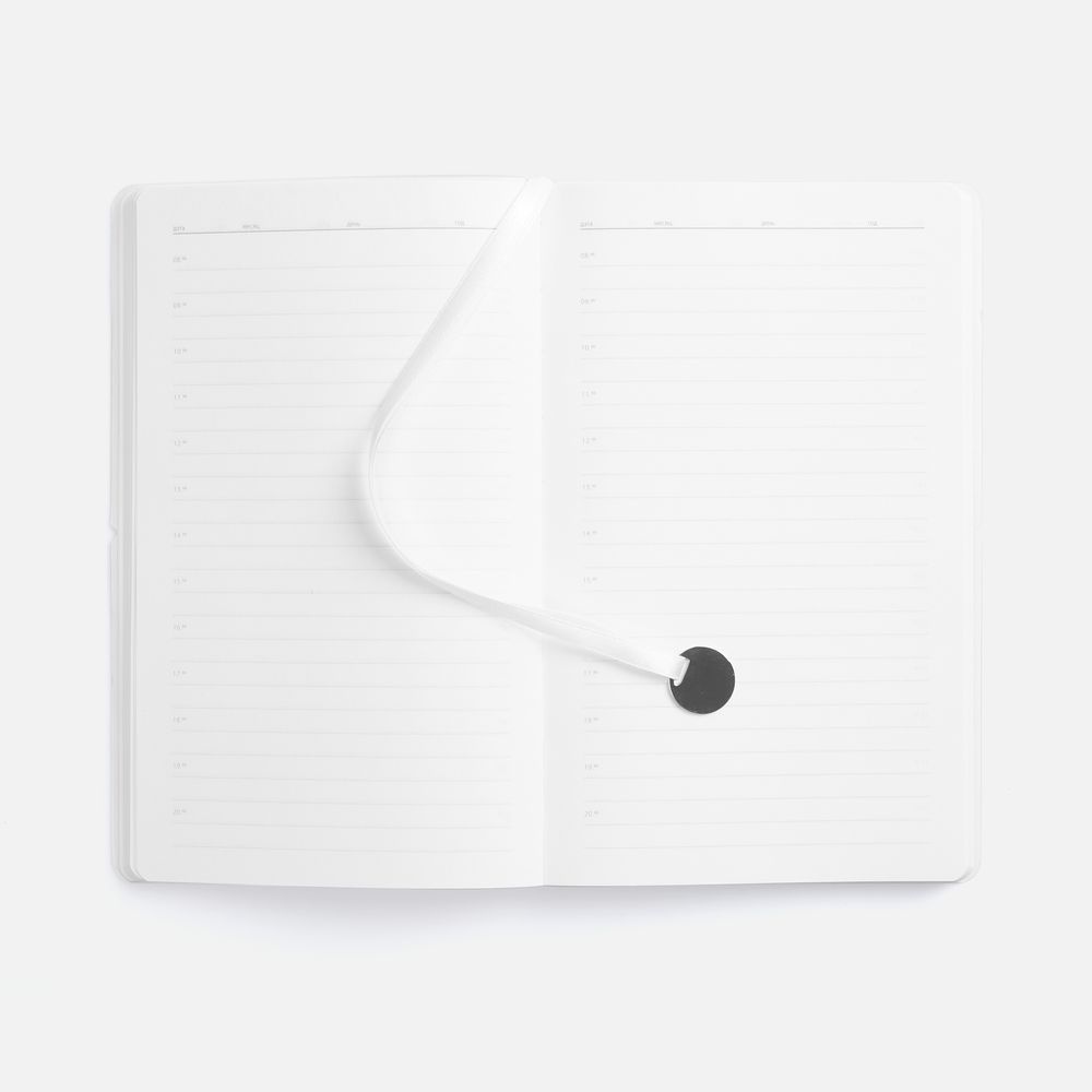 Ежедневник с гибкой обложкой, выполнен из материала Waltz, белый BB, дополнен ляссе в цвет обложки с металлическим шильдом.Блок 951, без календарной сетки и информационного блока:Кол-во страниц — 256;Бумага — белая, плотность 70 г/м?;Форзац и нахзац — белые.