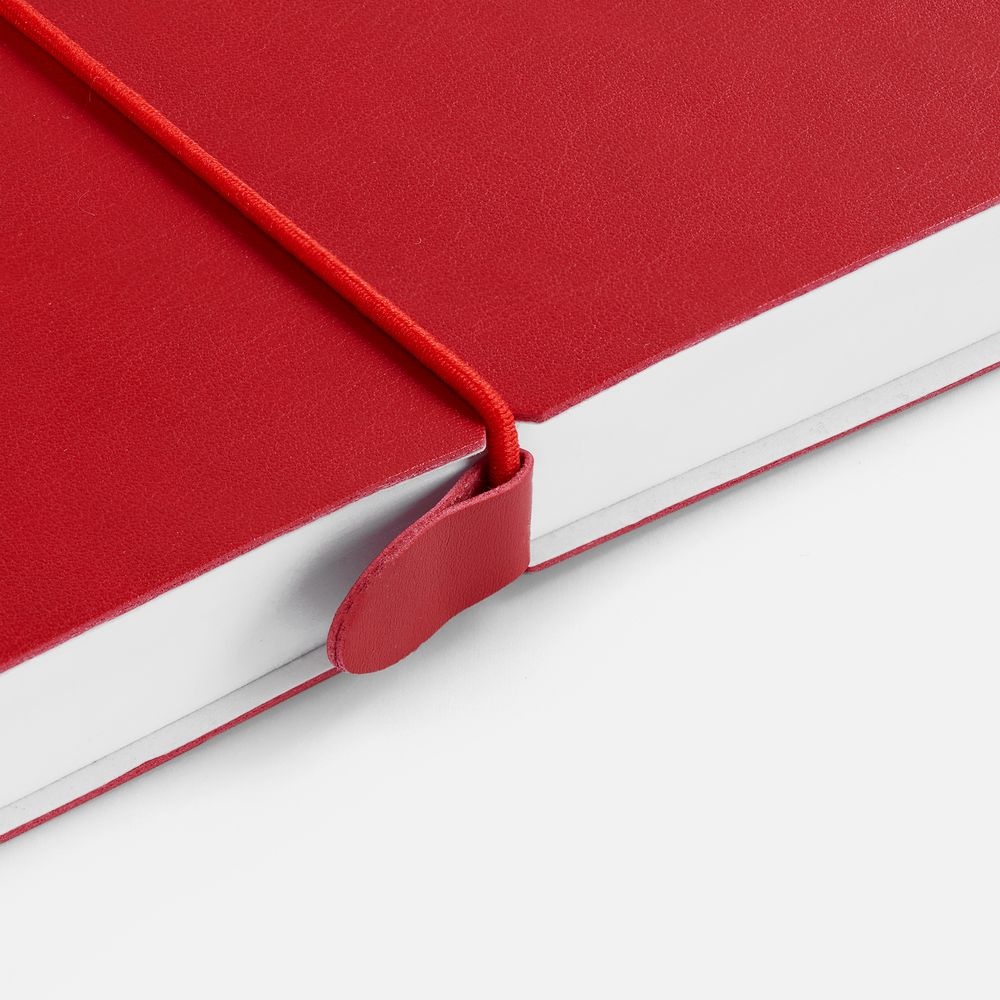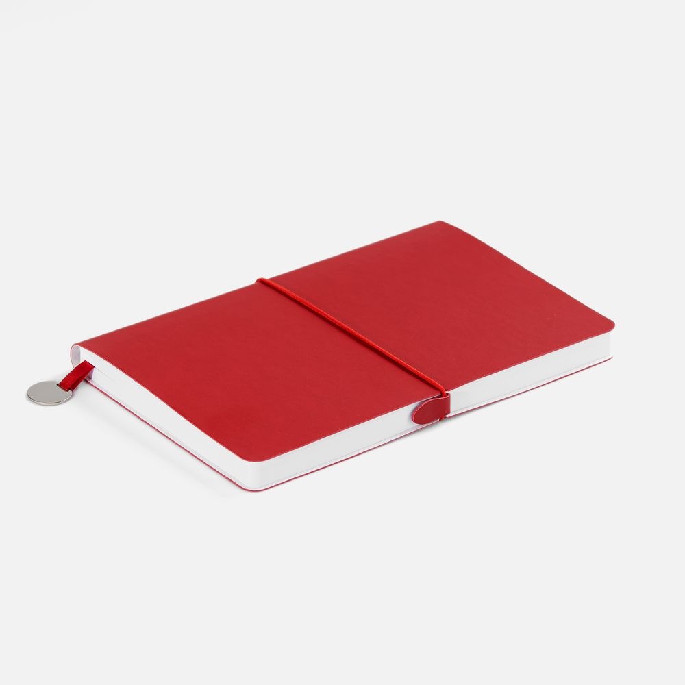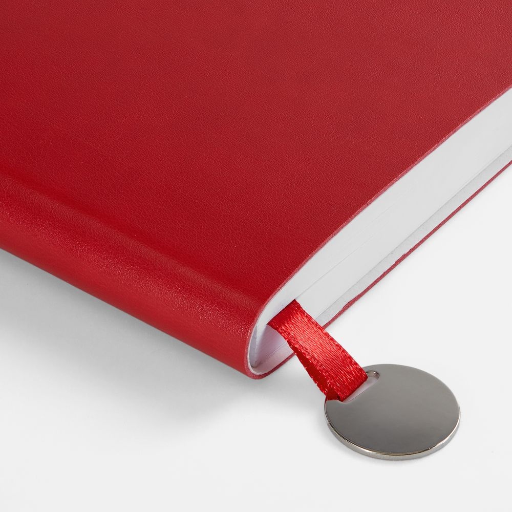Ежедневник с гибкой обложкой, выполнен из материала Waltz, красный РР, дополнен ляссе в цвет обложки с металлическим шильдом.Блок 951, без календарной сетки и информационного блока:Кол-во страниц — 256;Бумага — белая, плотность 70 г/м?;Форзац и нахзац — белые.