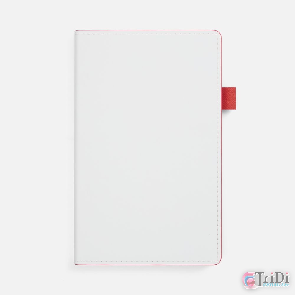 Гибкая обложка, материал обложки — Soft Touch, белый BB; внутренний материал — Latte красный РР; материал петли для ручки — Nice Touch Ultra, красный РР. Срез обложки окрашен в красный цвет.