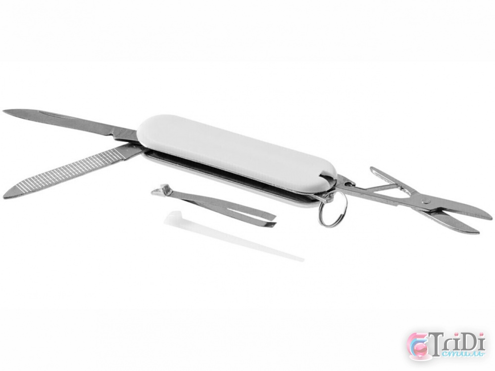 Карманный нож с ножницами на пружине, пинцетом, зубочисткой, пилкой для ногтей и миниатюрным кольцом для ключей.