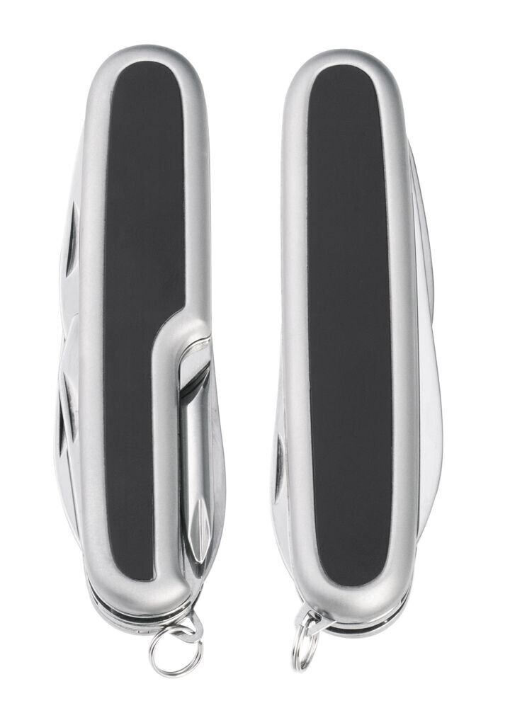 Имеет 7 функций: ножоткрывашка для бутылок с плоской отверткойоткрывашка для консервных банок с плоской отверткойкрестовая отверткакольцо для ключейпробойник