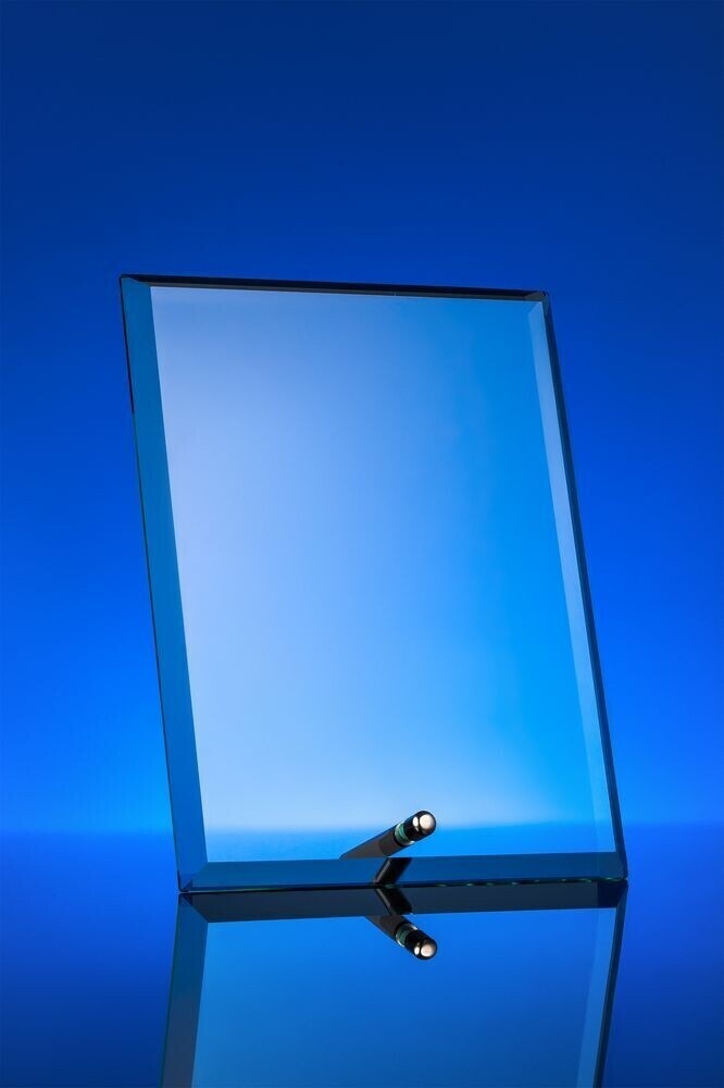 Стеклянная плакетка с металлической подставкой-ножкой. Срезанные под углом края красиво преломляют свет.Поставляется в разобранном виде.