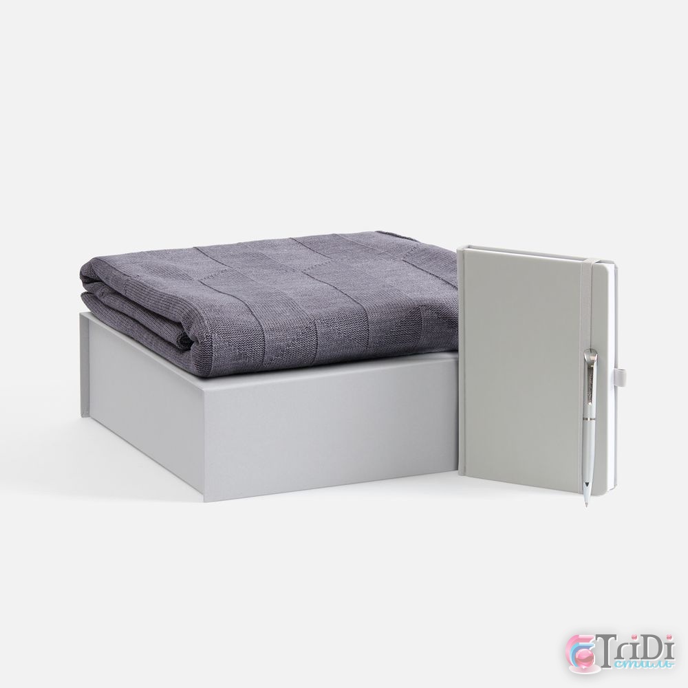 Однотонный набор с основной канцелярией и пледом — классика жанра в уютном исполнении. С компактным ежедневником будет удобно делать заметки в любое время — благодаря петельке для ручки любимый пишущий инструмент будет всегда под рукой. А изысканный акриловый плед с геометрическим узором позволит выразить самые теплые пожелания и ддобавит плавных линий в интерьер.