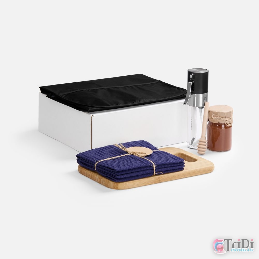 | Материал | спрей-дозатор - нержавеющая сталь, пластик, АБС; фартук - полиэстер 100%, 240Т, дюспо; доска - бамбук; полотенца - хлопок 100%, плотность 240 г/м?; ложка для меда - береза, алтайская; коробка - микрогофрокартон, Т-23Е |