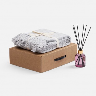 | Материал | плед - хлопок 80%, полиэстер 20%, плотность 260 г/м?; флакон - стекло, палочки из файбера; коробка - микрогофрокартон |