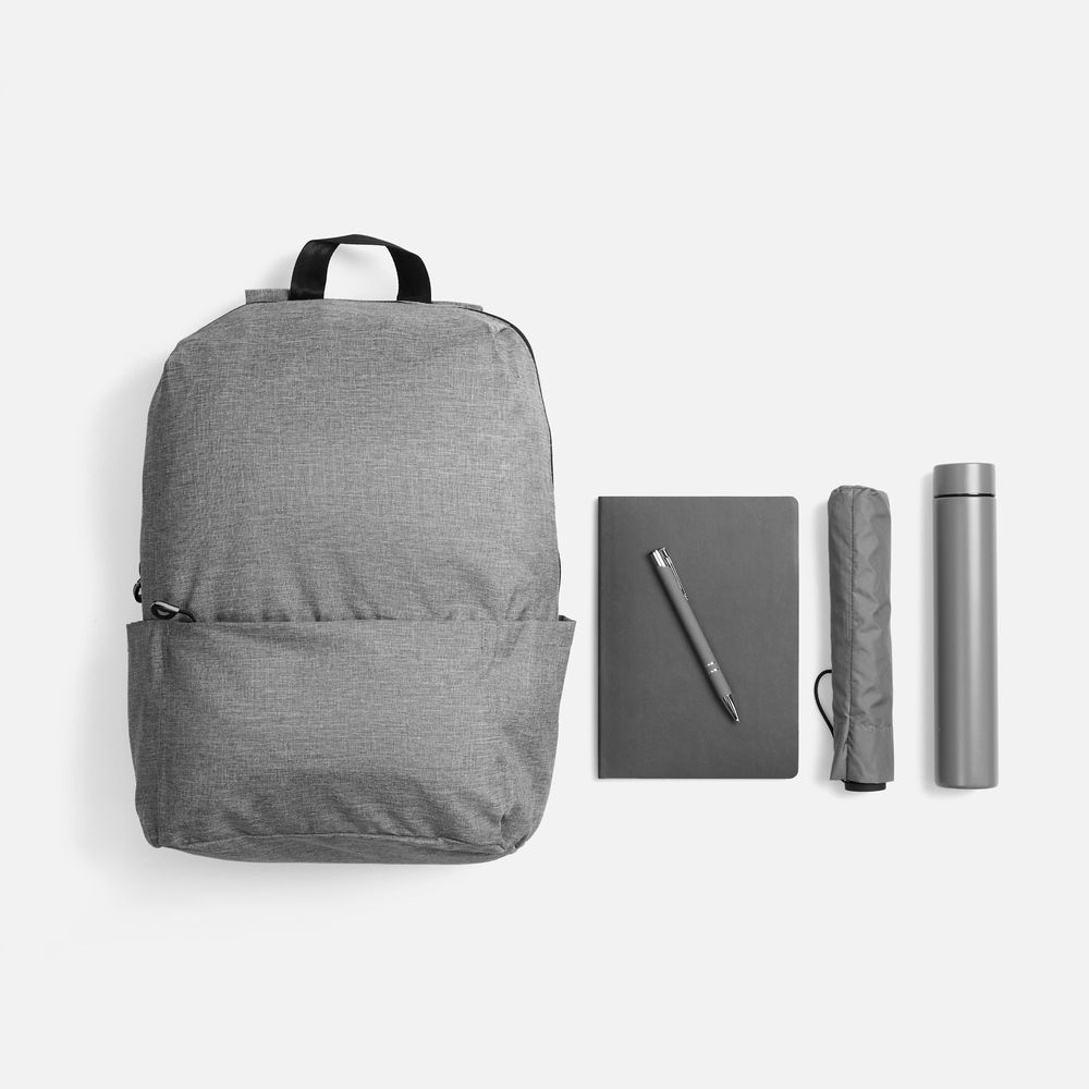 Размеры | рюкзак: 27x40x14 см; зонт: длина 49 см, диаметр купола 90 см, длина в сложении 22 см; термобутылка: высота 23,5 см, диаметр 4,3 см; блокнот: 15,5х21х1 см; ручка: 13,7х0,8 см |