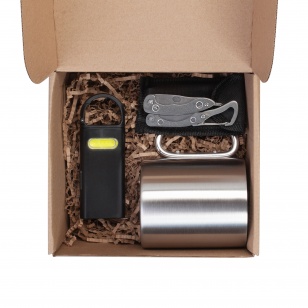 В набор входит: кружка "Огайо" 1032 (объем 300 мл, размер 9 х d 7,5 см); мультитул "Duty" 9в1 5420-7 (размер 8,4 х 1,3 х 2,8 см); фонарик "Spark" 6799 (размер 4 х 11,2 х 1,4 см); гофрированный 30 гр, крафт (плотность 80 гр, ширина 4 мм); коробка 3386 (размер 17,6 х h 8,3 х 15,3 см).