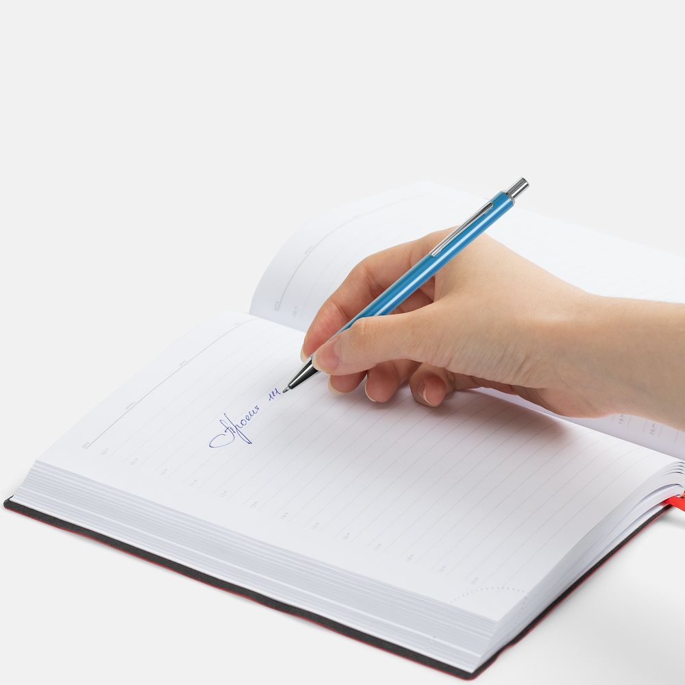 Изящная ручка с тонким корпусом.Механизм ручки: нажимной.Корпус ручки разбирается, стержень легко заменить.Стержень с синими чернилами.Длина линии письма: 500 м.Гравировка по цветным частям корпуса получается белой.