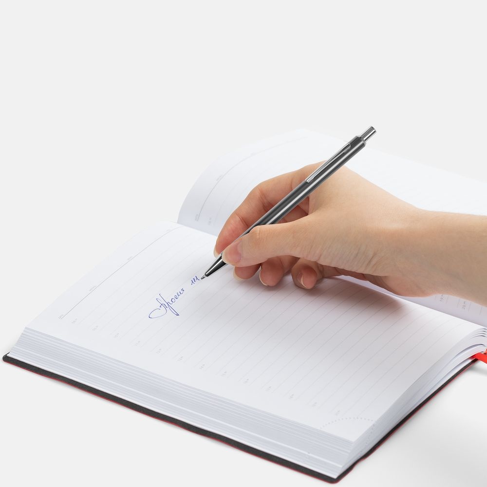 Изящная ручка с тонким корпусом.Механизм ручки: нажимной.Корпус ручки разбирается, стержень легко заменить.Стержень с синими чернилами.Длина линии письма: 500 м.Гравировка по цветным частям корпуса получается белой.