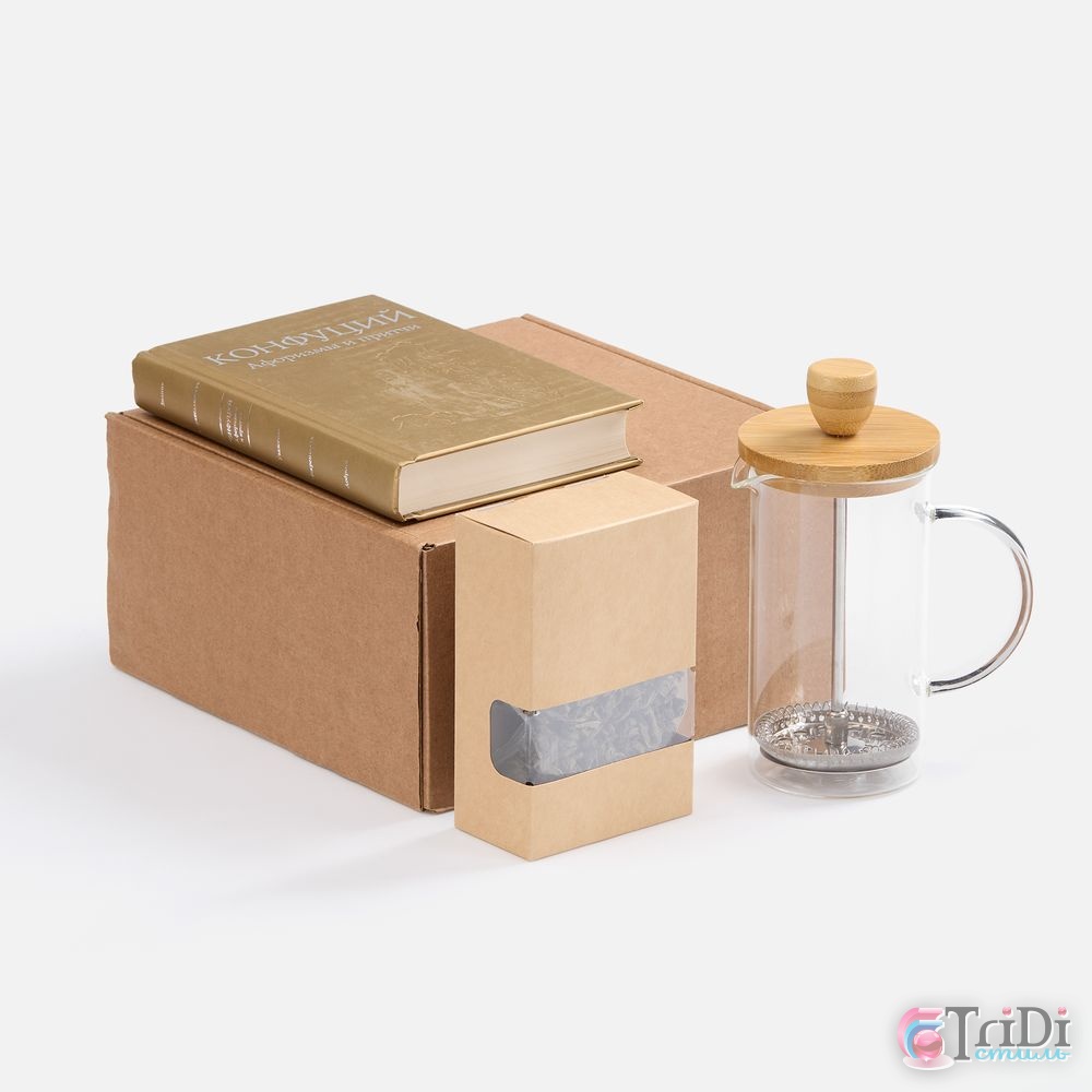 | Материал | френч-пресс - боросиликатное стекло; нержавеющая сталь; бамбук; коробка - микрогофрокартон, плотность 385 г/м? |