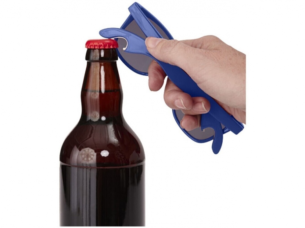 Оригинальные солнцезащитные очки из пластика являются не только стильным летним аксессуаром, но также полезной функциональной вещью. На концах дужек очков расположены открывалки. На оправу можно нанести контрастное изображение и текст.