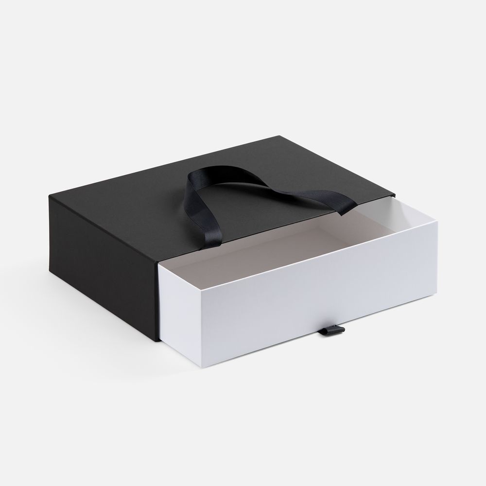 Коробка-кейс с выдвижным внутренним отделением. Внешний короб каширован дизайнерской бумаги и оснащен прочными ручками из репсовой ленты. Внутренний короб отделан белой бумагой, ламинированной матовой пленкой.Рекомендованная нагрузка до 1,5 кгРучки не съемные.