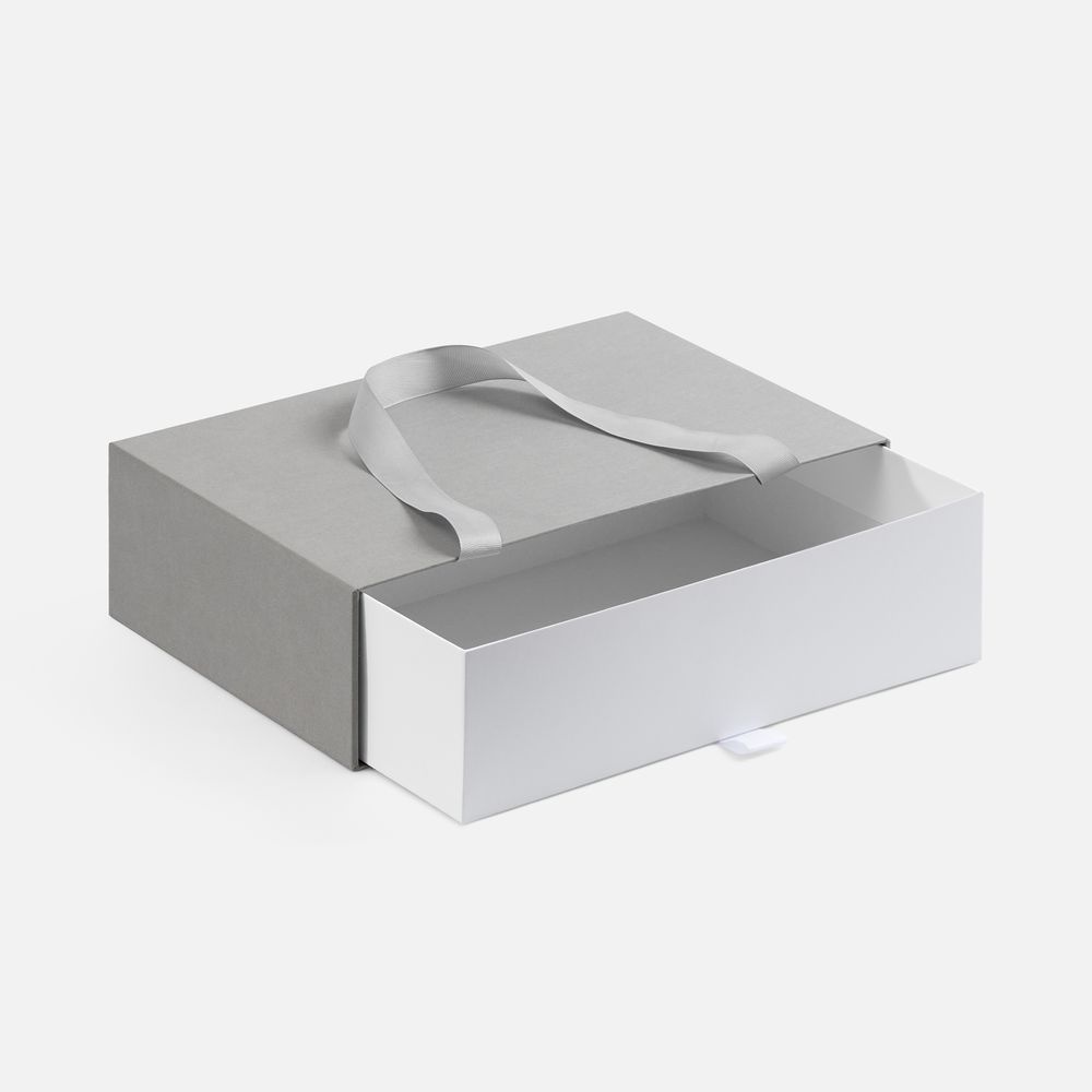 Коробка-кейс с выдвижным внутренним отделением. Внешний короб каширован дизайнерской бумаги и оснащен прочными ручками из репсовой ленты. Внутренний короб отделан белой бумагой, ламинированной матовой пленкой.Рекомендованная нагрузка до 1,5 кгРучки не съемные.