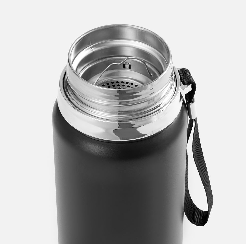 Умный термос Termino отображает температуру жидкости на ЖК-дисплее — точные данные собирает встроенный в крышку датчик.Стенки из нержавеющей стали и вакуумная изоляция корпуса сохраняют напитки горячими (60 °C) в течение 8 часов или прохладными (10 °C) в течение 12 часов.Съемное ситечко помогает удобно и аккуратно заварить в термосе чай, кофе или травяной сбор.Встроенная батарейка обеспечит работу дисплея до 1000 нажатий или одного года работы. Объем 800 млКорпус из нержавеющей стали внутри и снаружиСенсорный ЖК-дисплейРемешок для запястьяИнформация о температуре жидкостиРаботает от встроенной незаменяемой батарейки типа CR2032 (в комплекте)Поставляется в индивидуальной упаковке.