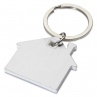 Брелок для ключей в форме домика с цветной вставкой из пластика между 2-мя серебристыми пластинами из стали.