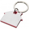 Брелок для ключей в форме домика с цветной вставкой из пластика между 2-мя серебристыми пластинами из стали.